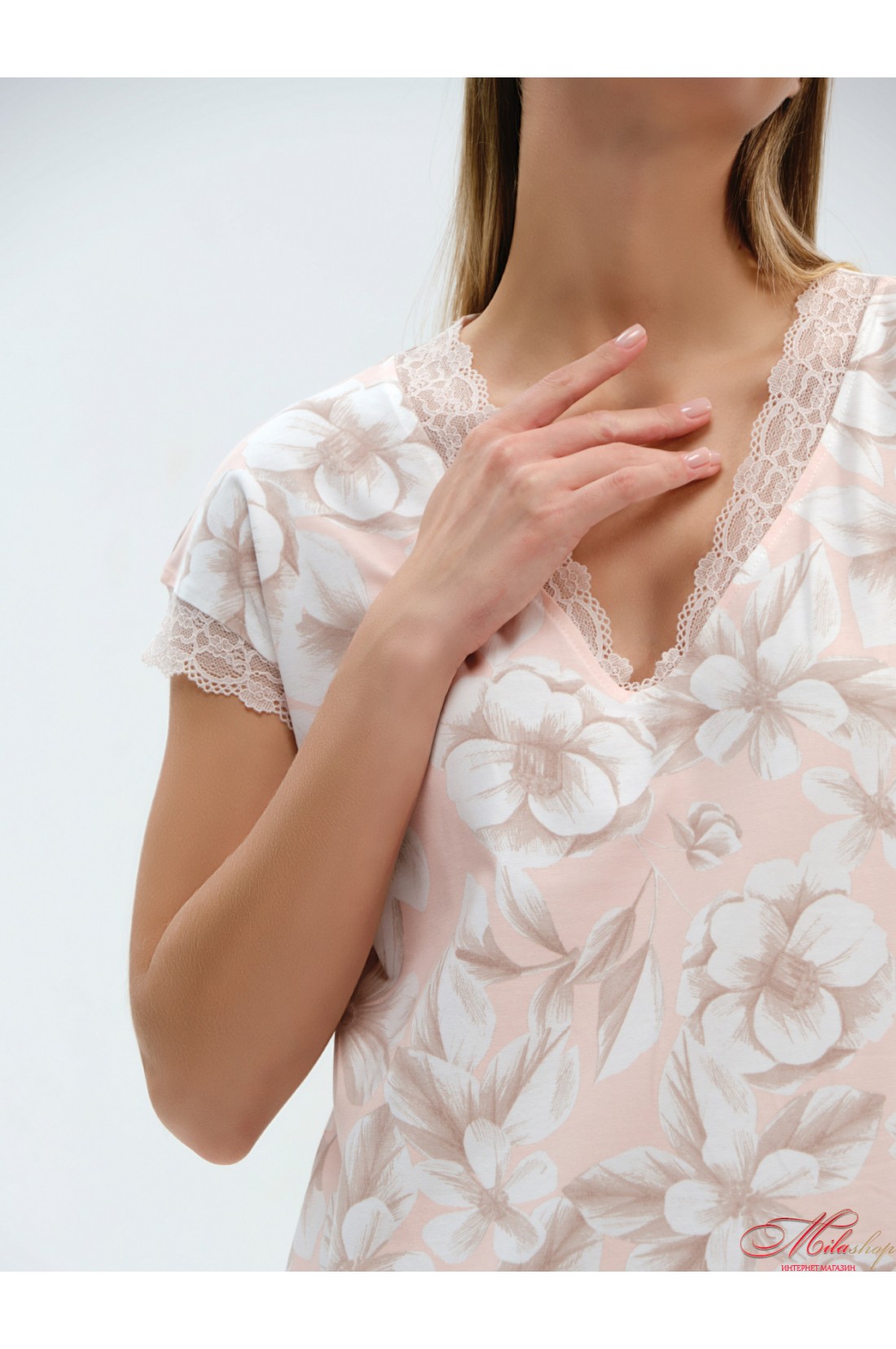 95% cotton, 5% elastane. Чувственная коллекция из невероятно нежного хлопка и волшебного кружева. Вдохновившись красотой и хрупкостью цветочных лепестков, дизайнеры наполнили модели трогательными узорами, которые подчеркнут бескомпромиссную привлекательность и красоту. Цветовая палитра собрала пастельные оттенки, что подарит невероятный покой, комфорт и уют. Изысканный и незабываемый фасон ночной рубашки создает романтическое настроение. В сочетании с полуприлегающим силуэтом модель всегда смотрится свежо и привлекательно. Особой изюминкой является роскошное кружево по линии декольте и рукавам, что придает нежному образу пикантности и привлекательности.