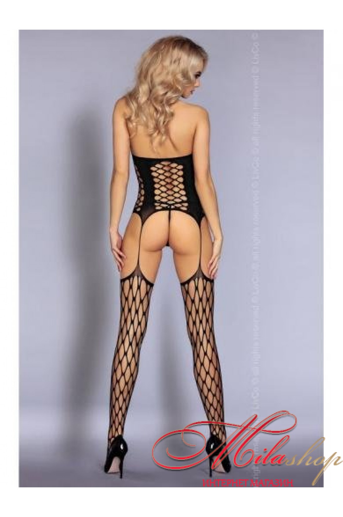 Кэтсьюит с открытой спиной, имитирующий корсет с пажами, соединенный с чулками. Выполнен из эластичного сетчатого материала.