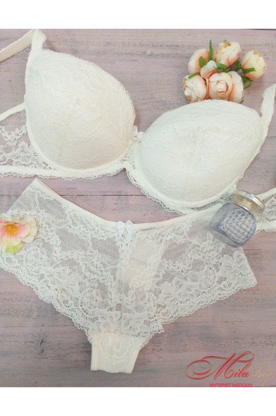 Нежный комплект состоящий из бюстгальтера балконет и трусиков шортиков. Выполнен из элегантного кружевного полотна производства Жасмин. Между чашками бюст украшен элементом сваровски. Съемный пуш-ап. Бретели украшены кружевом. Трусики полностью кружевные, ластовица хлопок.