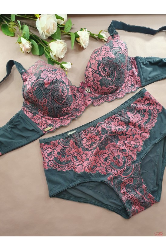 Бюстгальтер на косточках, мягкая тканевая чашка (слабо растягивается), без поролона. Чашка украшена красивым кружевом. За счет своей конструкции бюстгальтер хорошо держит грудь. Трусики слипы из микросеточки и кружева.