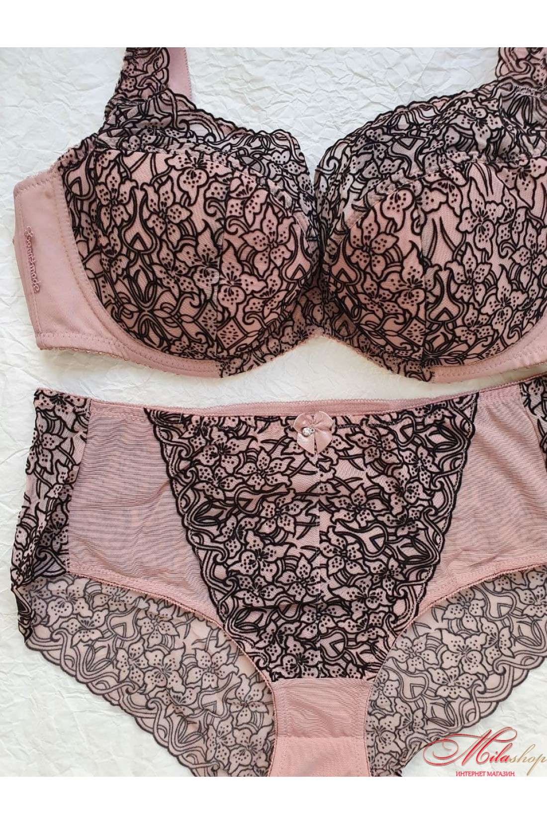 Бюстгальтер полу-поролон, с широкими бретелями. Чашечки украшены флоковым рисунком. Роскошные трусики с линией талии немного выше средней. Передняя часть трусиков выполнена из хлопка с накладным сетчатым полотном, задняя часть из нежного сетчатого полотна с узором из флока.