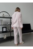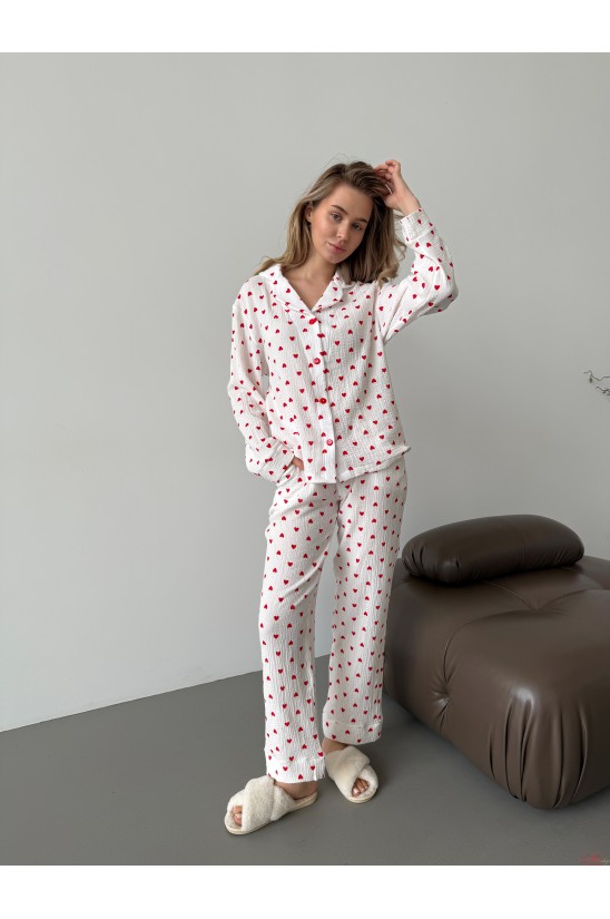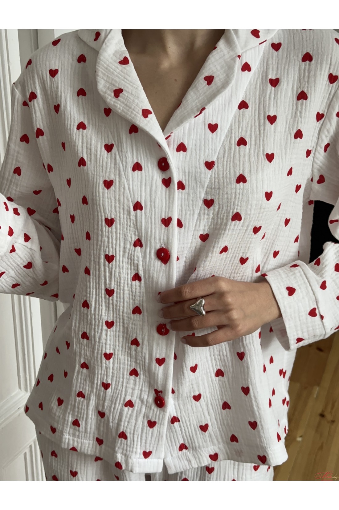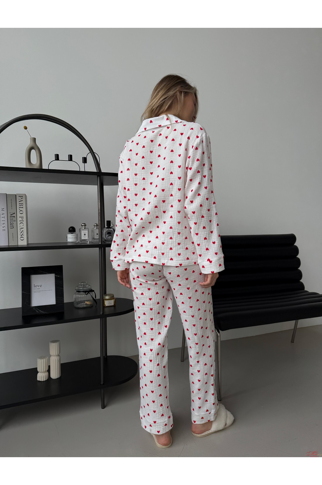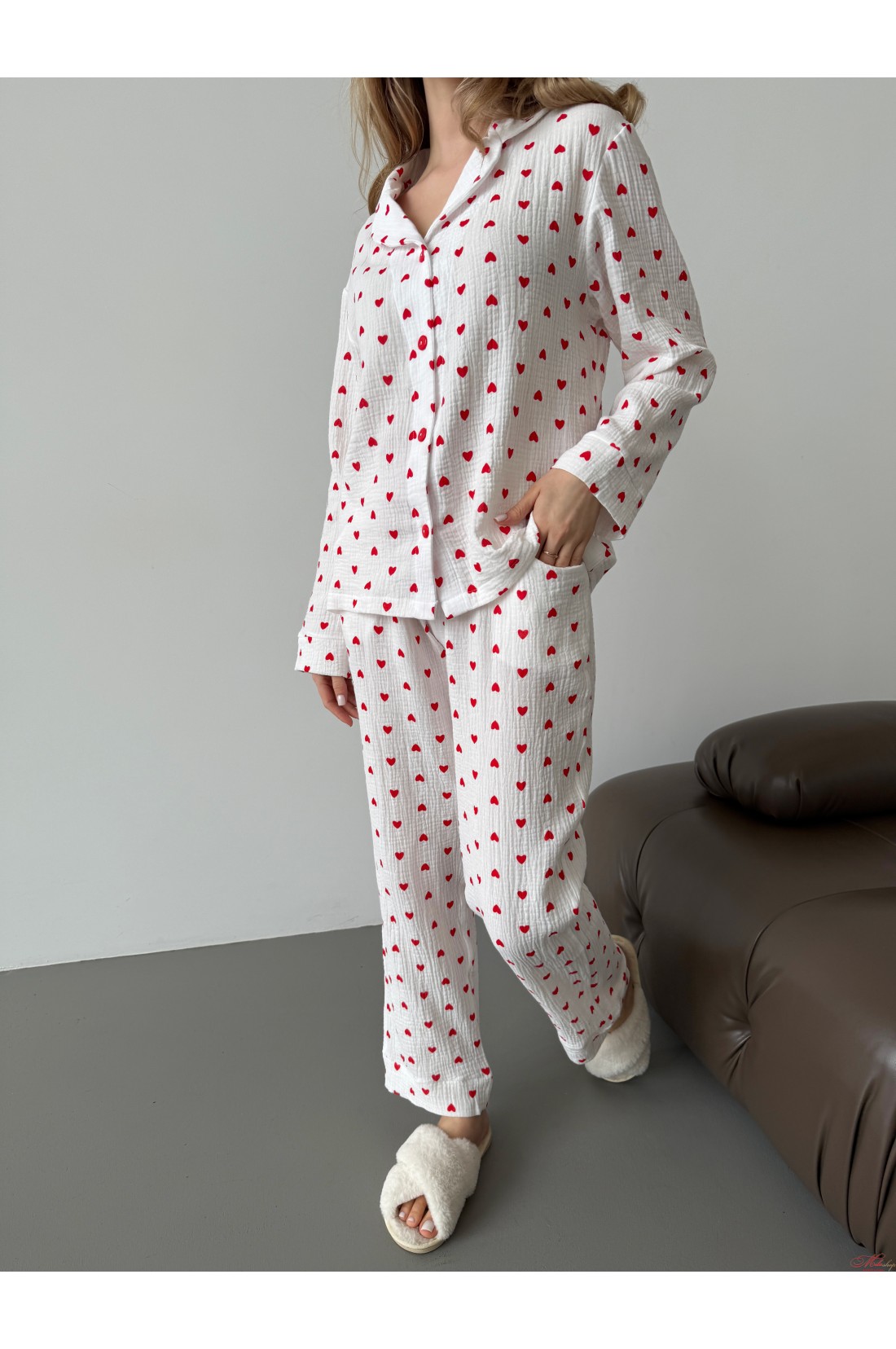 Женская пижама из муслина с сердечками. Когда речь идет об уюте и стиле одновременно, наша пижама из муслина – именно то, что нужно! Это комплект, состоящий из брюк и сорочки, выполнен из нежной муслиновой ткани с милым принтом в виде сердечек. Детали, которые влюбляют: