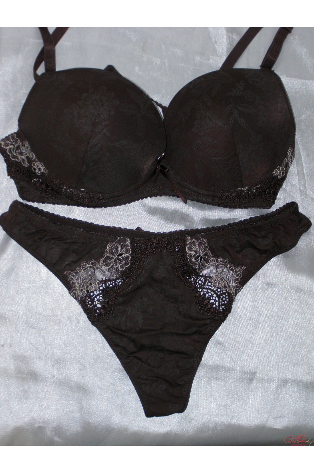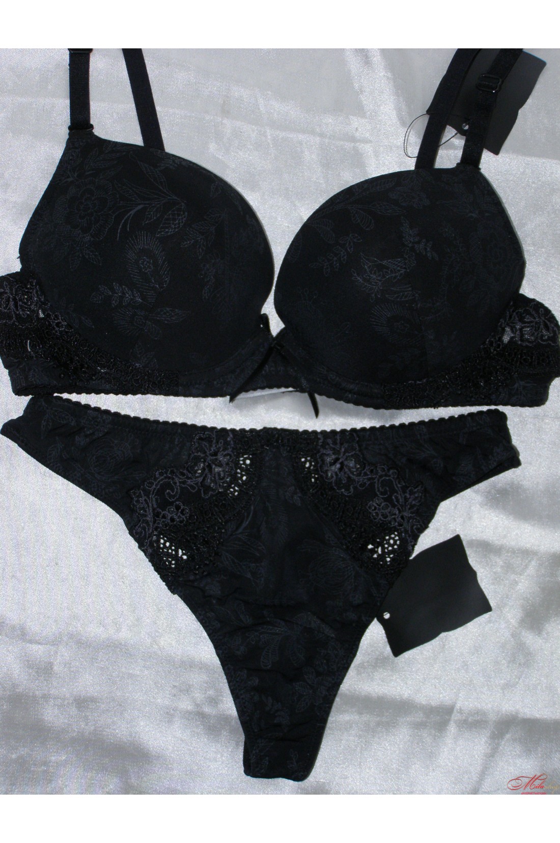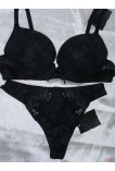 Шикарный комплект нижнего белья состоит из бюстгальтера с гелевым пуш-апом и трусиков-стринг с низкой линией талии. Съемные бретели. Украшен легким цветочным орнаментом. Задняя часть трусиков декорирована бантиком.