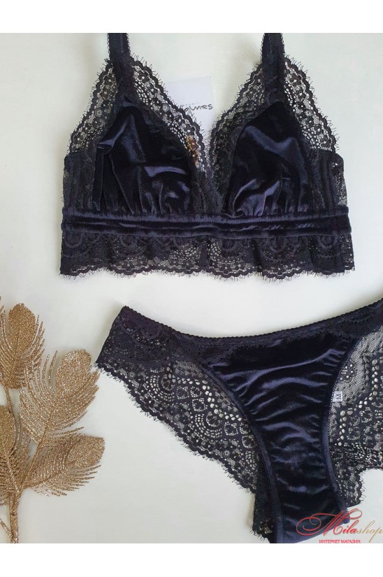 Изысканный комплект из черного бархата с с кружевом. Мягкий бюстгальтер-бралетт без косточек с кружевной окантовкой. Есть боковая косточка для лучшей поддержки. Трусики-бразилиана сзади полностью из полупрозрачного кружева, спереди из бархатистоно полотна. Хлопковая ластовица.