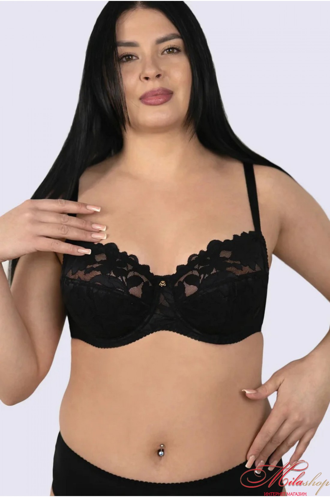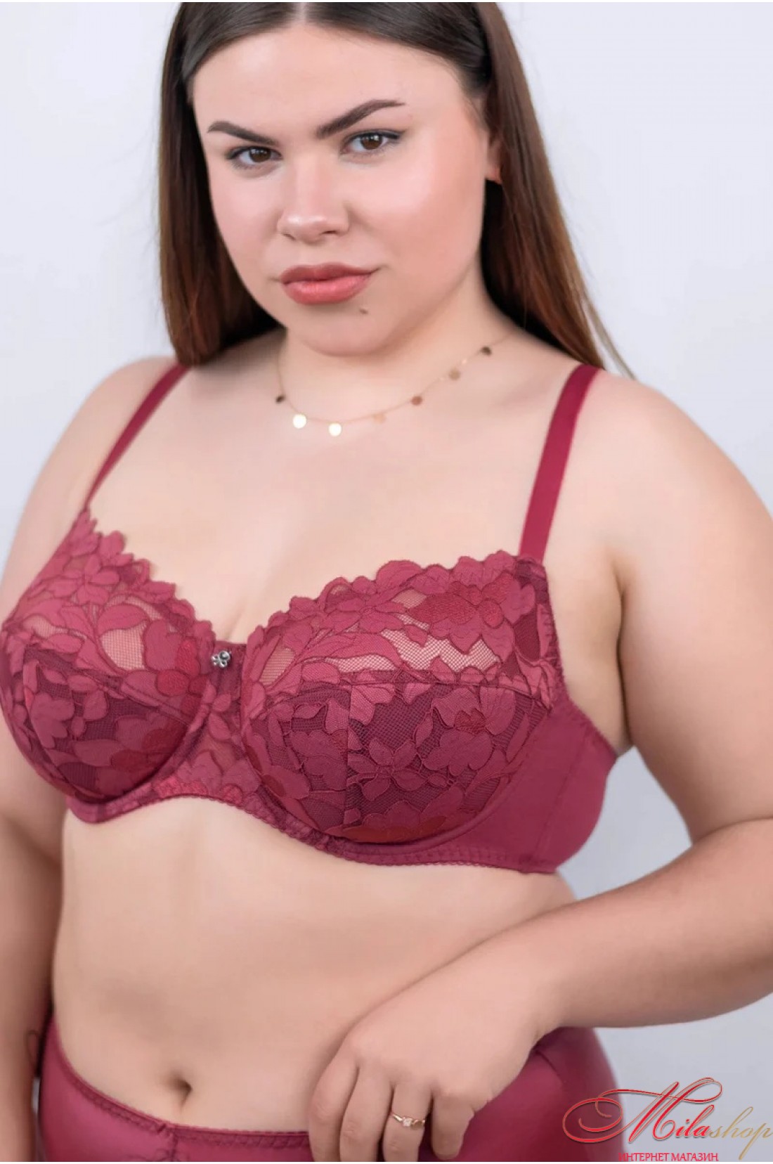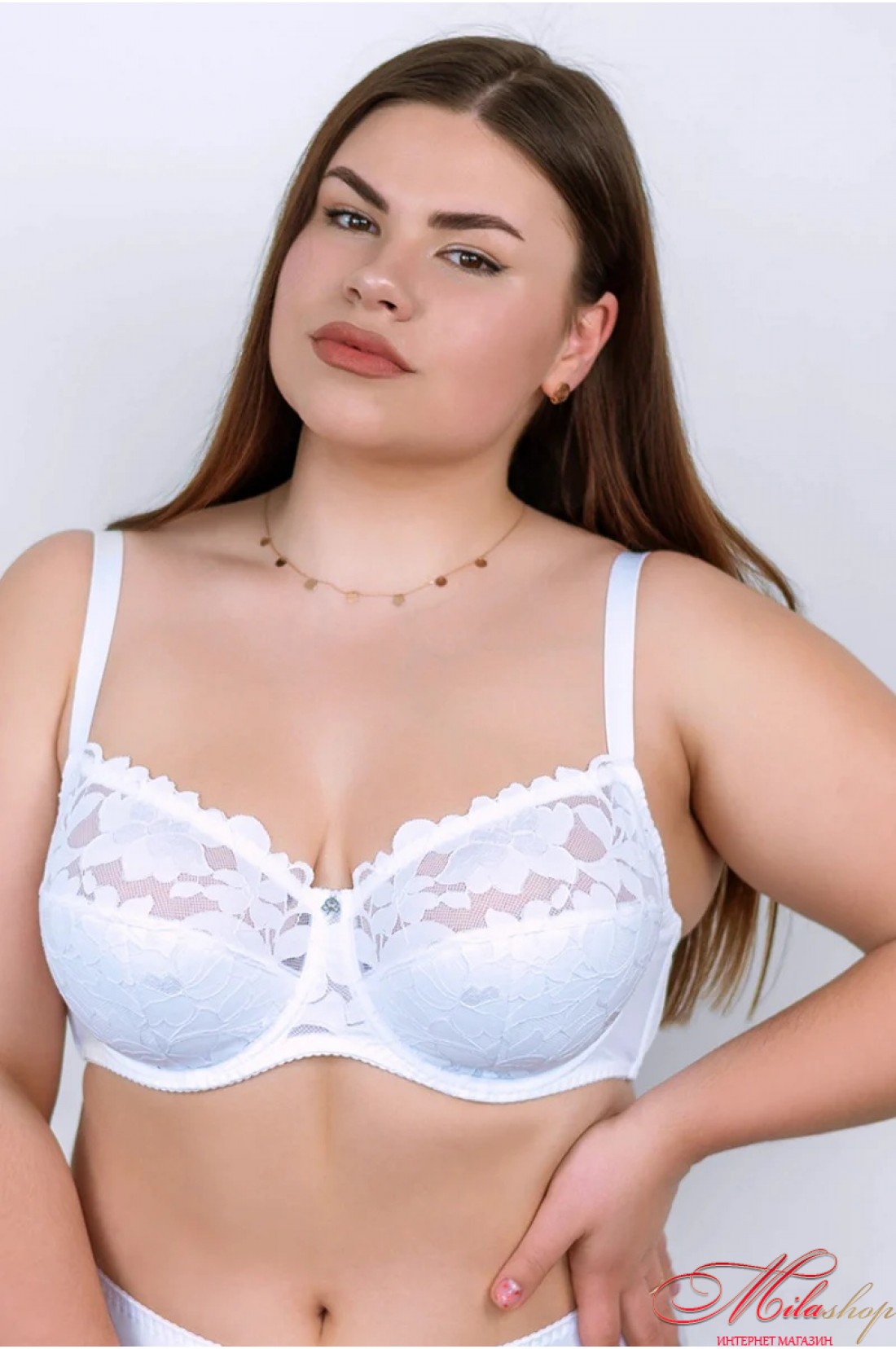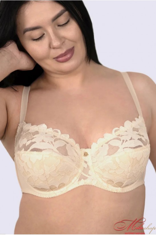 Кружевной бюстгальтер для поддержки пышной груди, полудублированные чашки на косточках поддерживают пышную грудь и не добавляют объем. Нижняя часть чашек дублированы поролоном, покрыта ткстурным кружевом с цветочным узором. Хлопковая подкладка изнутри не вызывает раздражение, соприкасаясь с кожей, бретели не отстегиваются, регулируются по длине, ширина бретелей 1,5-2 см (зависит от размера). Застегивается на спине: 2 ряда крючков, гладкая анатомическая спинка.