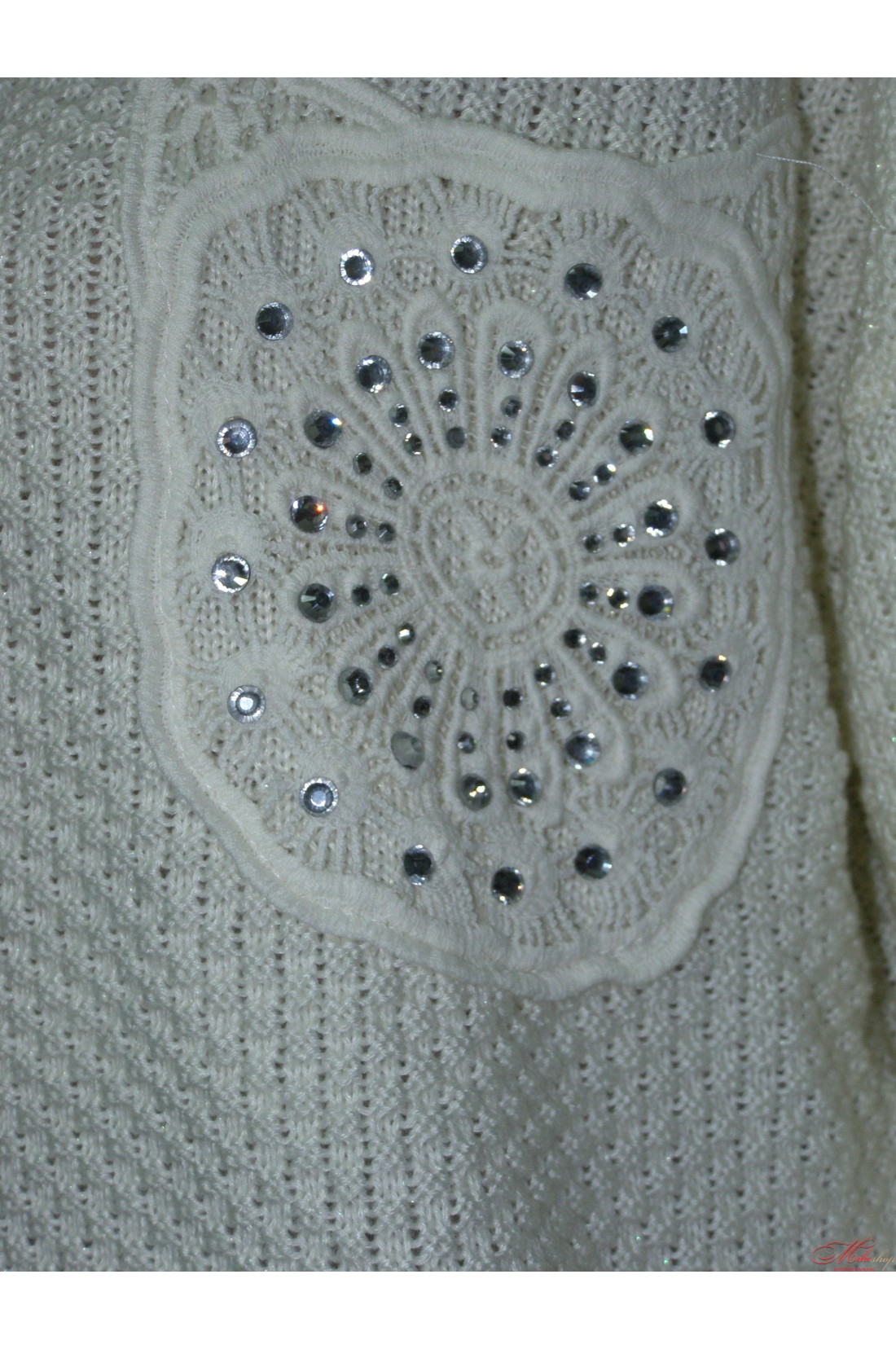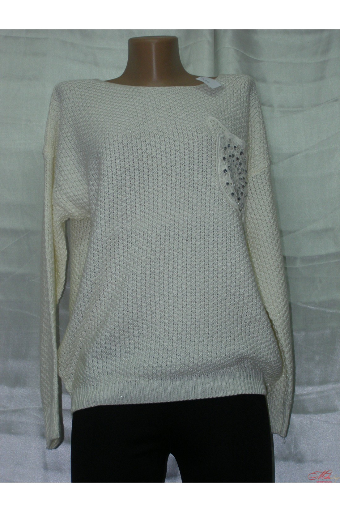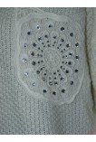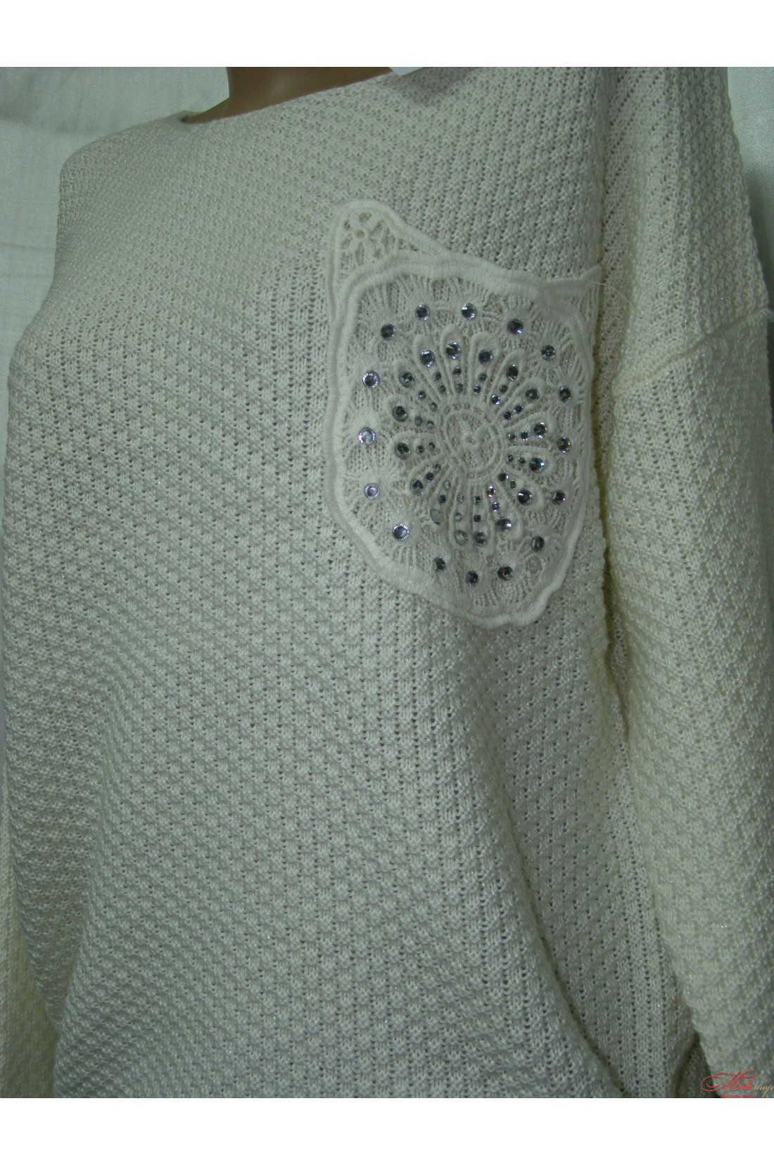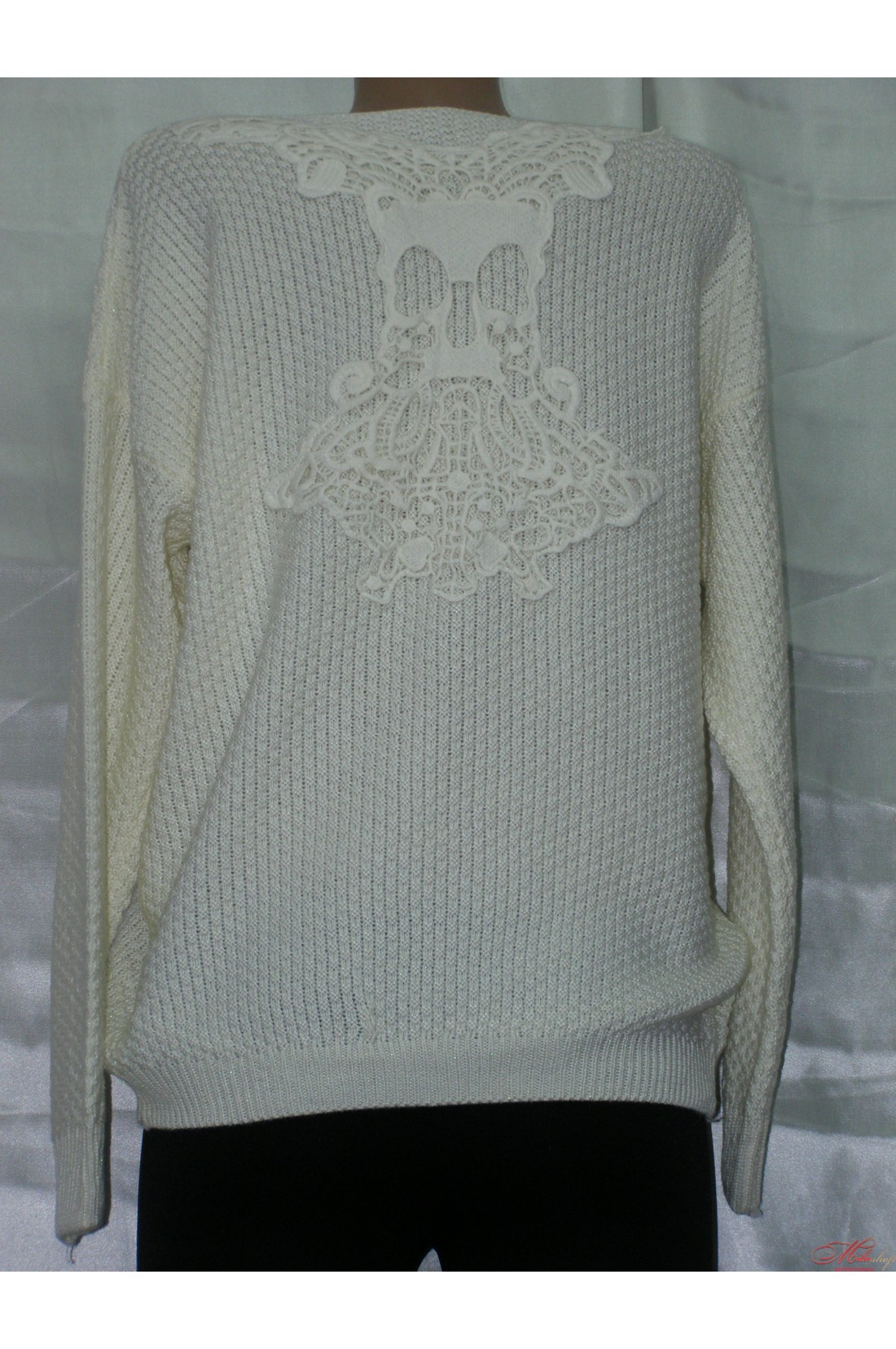 Очень красивый теплый свитер. Спинка украшена накладным кружевом. Передняя часть декорирована декоративными элементами. Размер универсальный (хорошо сидит на 46, 48, 50). Такой свитер отлично сочетается как с джинсами и лосинами, так и с юбкой.