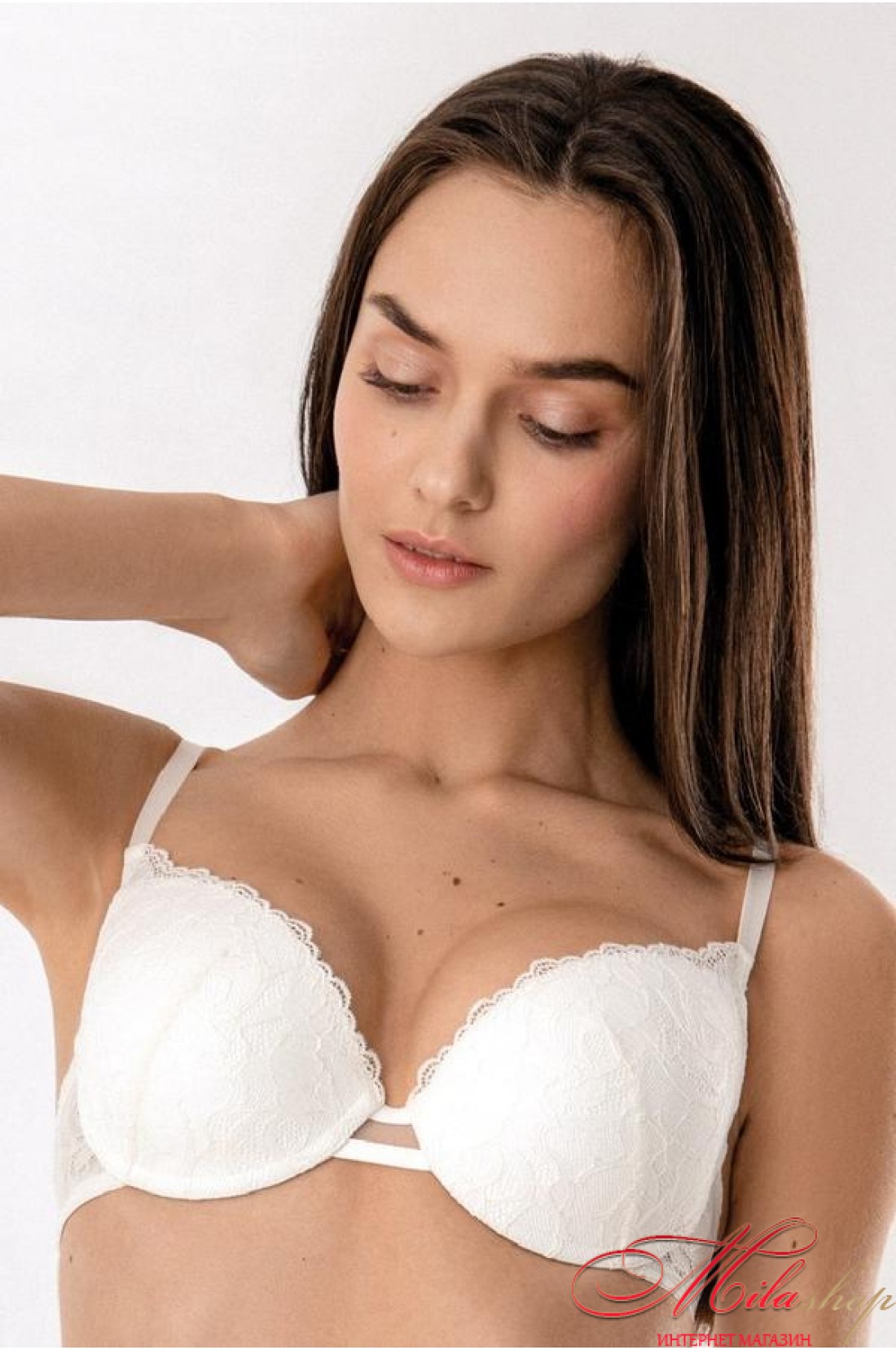 Бюстгальтер со встроенным push-up, формованные чашки на косточках. Выполнен из французского кружева. Чашки приподнимают грудь вверх и формируют соблазнительную линию декольте. Бретели не отстегиваются, регулируются по длине. Застежка на спине: 2 крючка на 2 позиции.