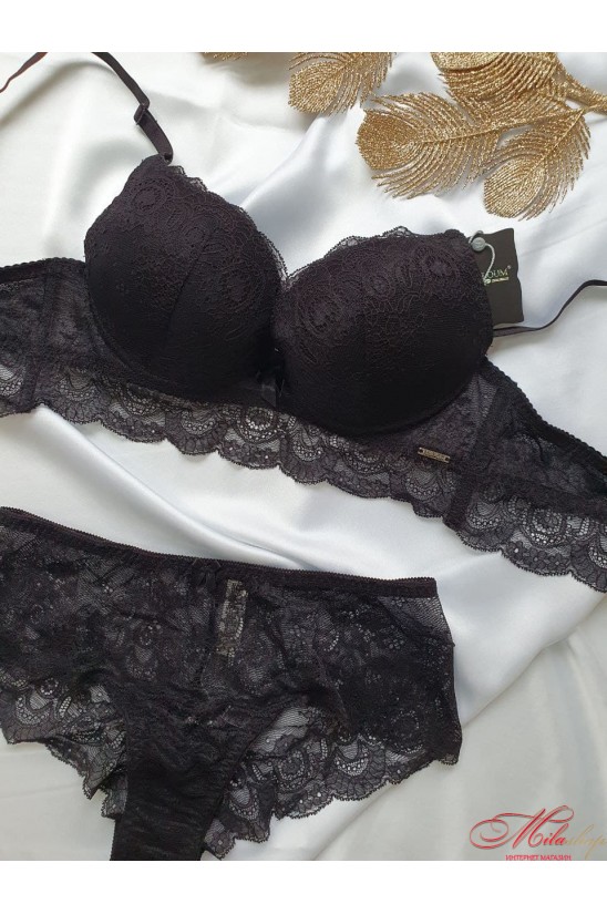 Очень красивый и комфортный комплект. Бюстгальтер с эффектом пуш-ап. Трусики-бразилиана полностью кружевные, хлопковая ластовица. Чашки бюстгальтера украшены кружевным полотном, широкий кружевной пояс, с дополнительными боковыми косточками.