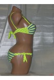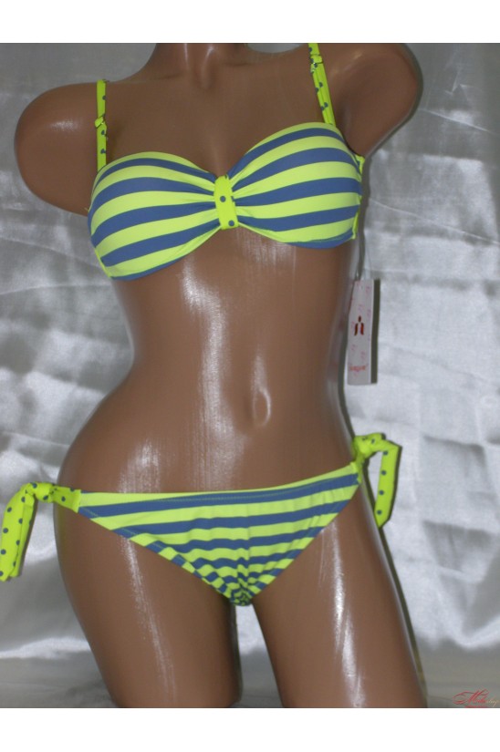 Купальник "бандо" с эффектом пуш-ап выполнен в ярком неоновом цвете, который велликолепно сочетается с серым. Купальник украшен полосатым орнаментом. Трусики с низкой линией талии. На завязках.