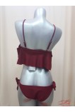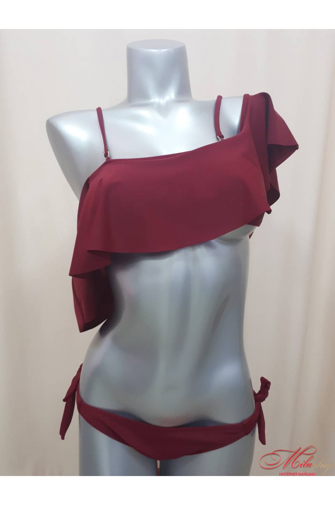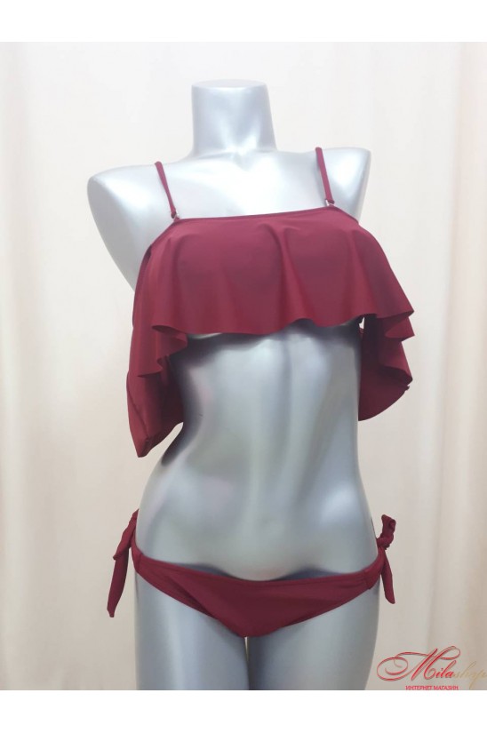 Купальник-топ, без чашек, поролоновыми съемными подкладками и декоративной рюшей. В цвете "марсала". Трусики-слип, на завязках.
