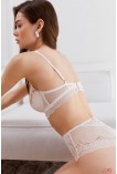 Бюстгальтер из деликатного кружева с узором, полудублированные чашки на косточках поддерживают грудь и придают ей округлую форму. Нижняя часть чашек из поролона, верхняя из кружева, бретели регулируются по длине, не отстегиваются. Кружевная спинка, застегивается на спине крючками.
