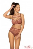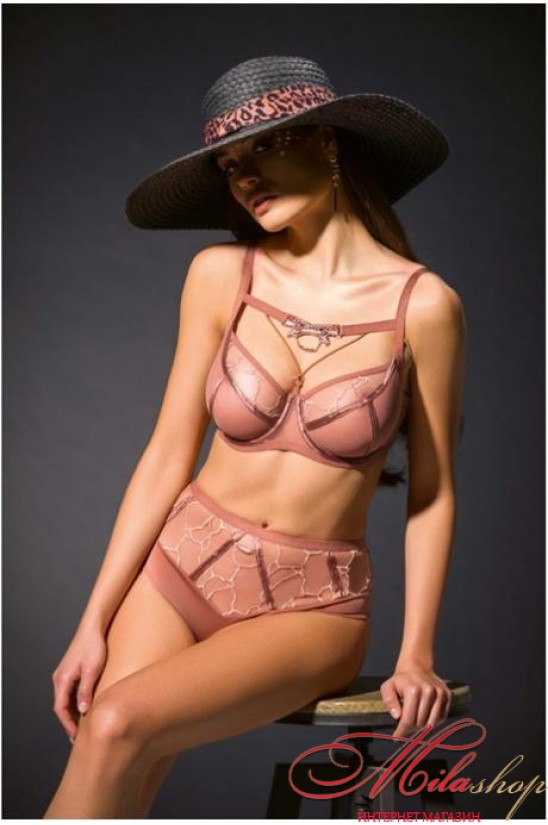 Бюстгальтер с вышивкой, полумягкие чашки на косточках приподнимают и моделируют грудь. Линия декольте подчеркивается атласными лентами и декоративными ремешками с металлической эмблемой жирафа, бретели не отстегиваются, регулируются по длине, застегивается на спине крючками. Линейка премиум AVA, лимитированная коллекция.