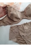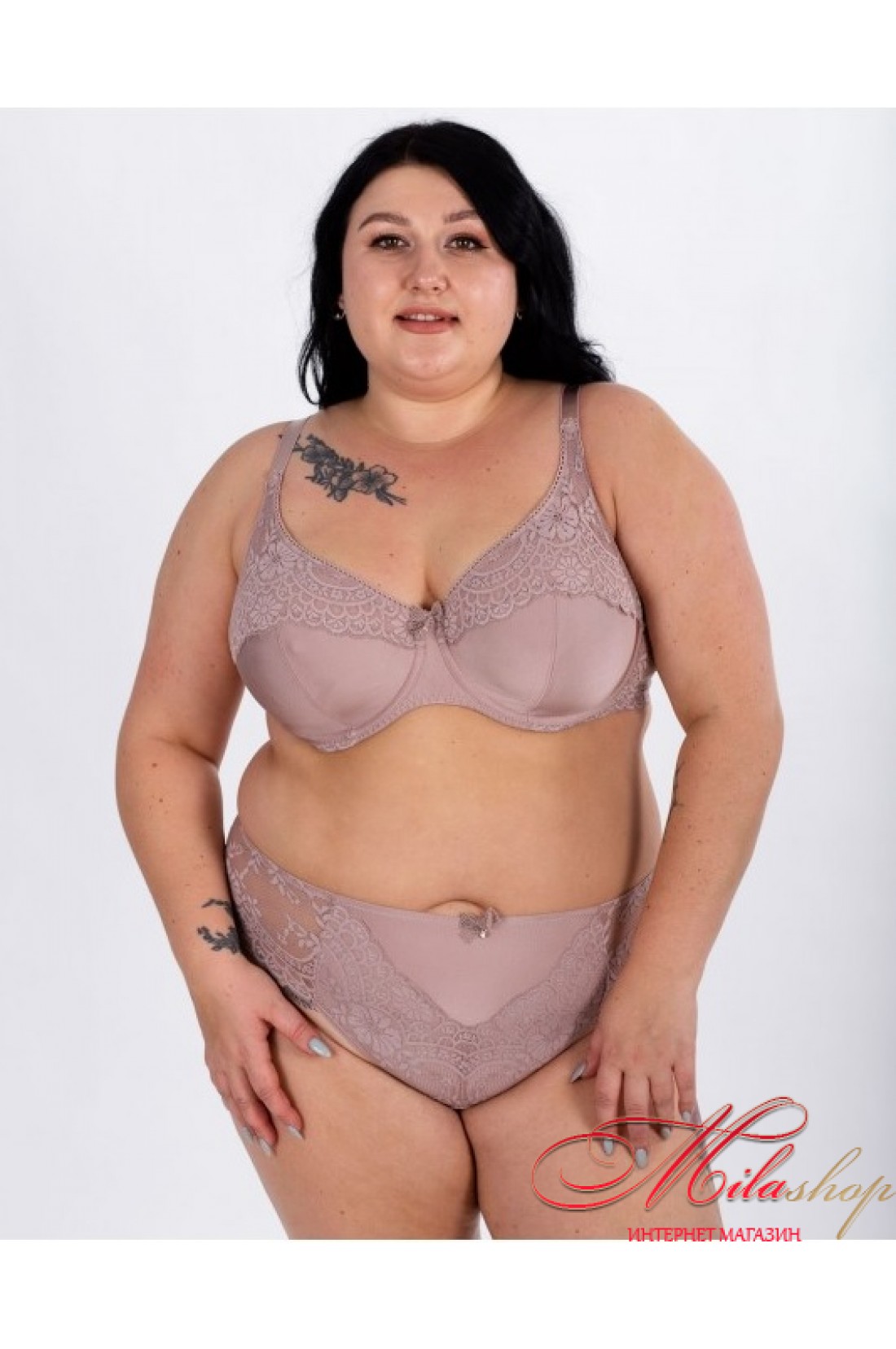 Бюстгальтер на косточках, мягкая тканевая чашка (слабо растягивается), без поролона. Чашка украшена красивым кружевом. За счет своей конструкции бюстгальтер хорошо держит грудь. Трусики слипы из микрофибры и кружева.