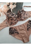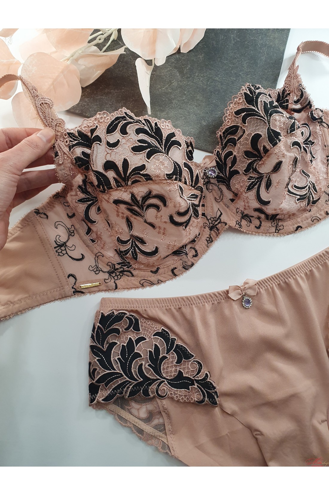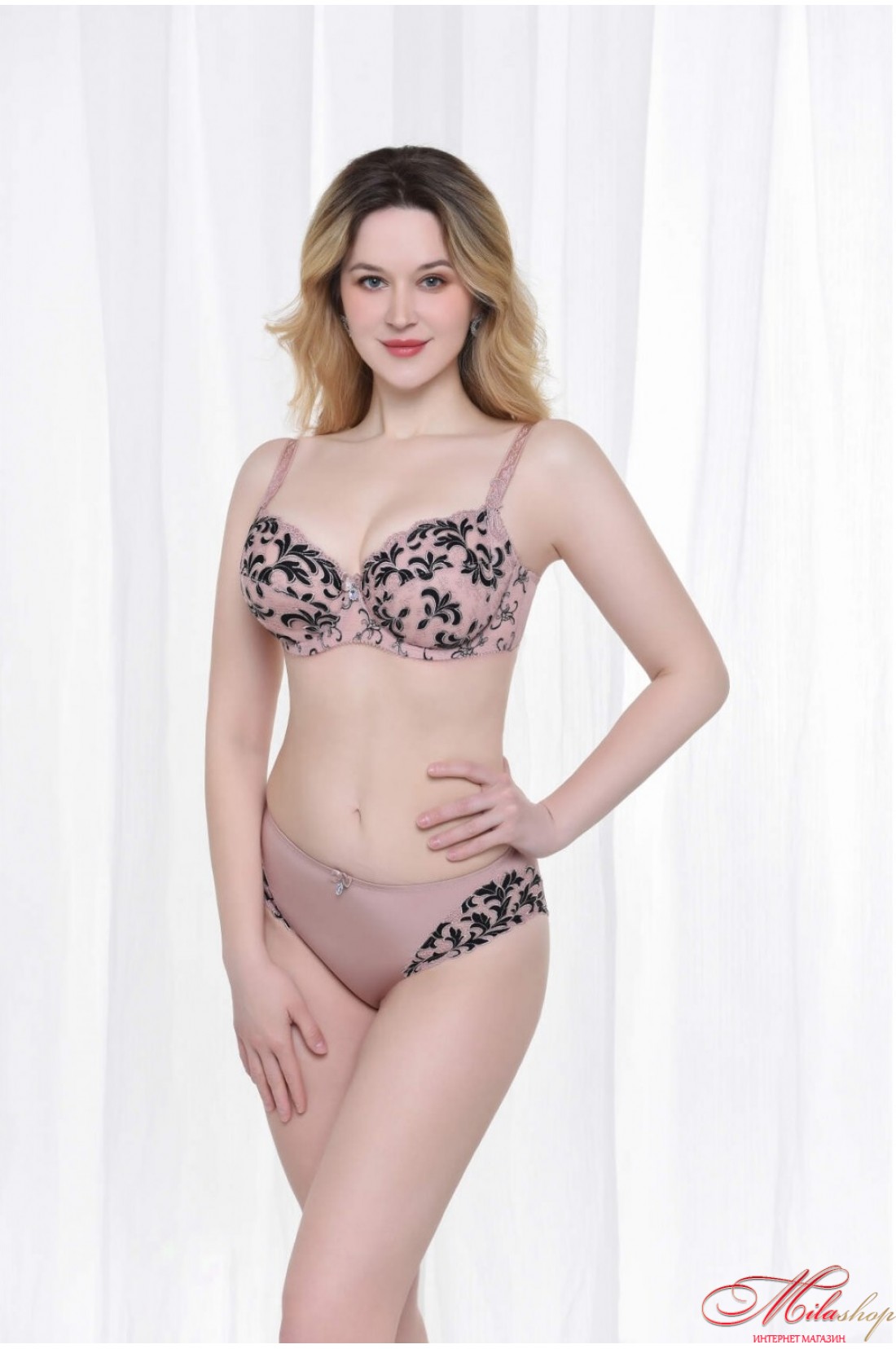 Бюстгальтер на косточках, мягкая тканевая чашка (слабо растягивается), без поролона. Чашка украшена красивым кружевом. За счет своей конструкции бюстгальтер хорошо держит грудь. Трусики слипы из микрофибры и кружева.