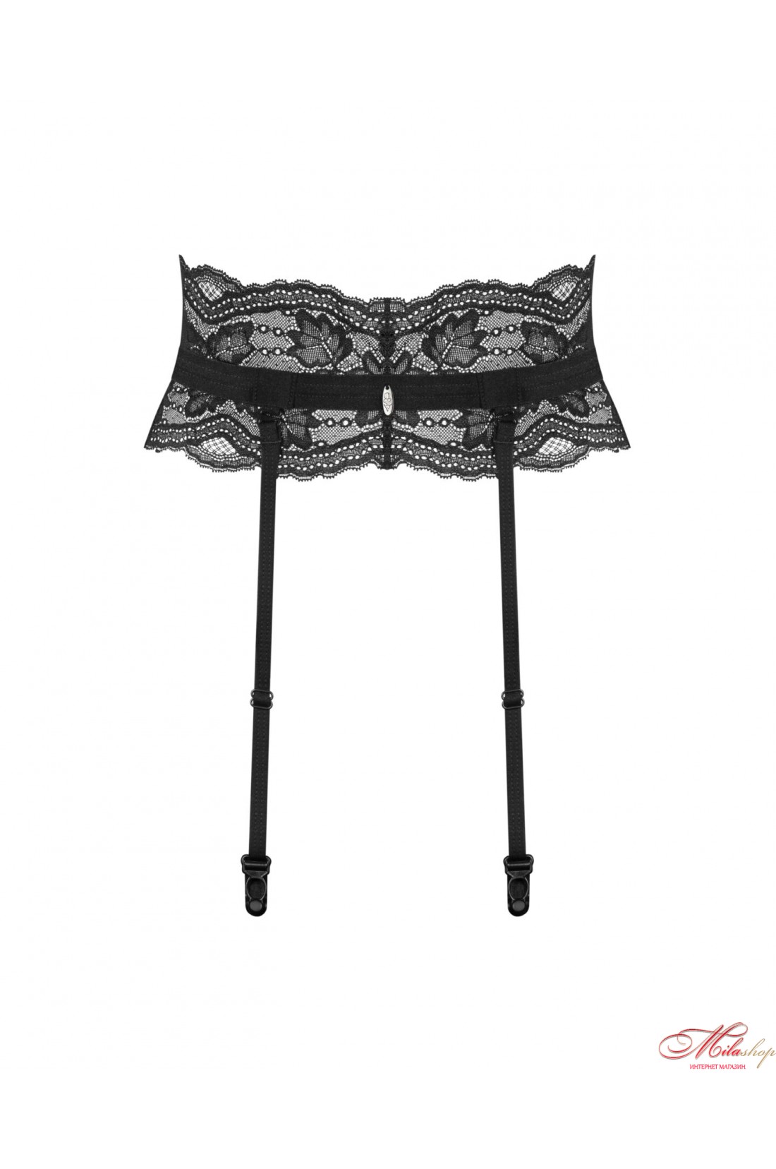 Пояс для чулок Obsessive Nutris из мягкого кружева с изящным рисунком из листьев. Ажурное полотно гармонично совмещается с бархатистой эластичной лентой по центру. Безупречную посадку на талии обеспечивает застежка на пять крючков, а регулируемые пажи позволяют крепить к поясу чулки любой длины — хоть до колен, хоть выше. Изюминку изделию придают дополнительные стрепы с петельками, которые можно прикрепить к подходящим крючочкам на бюстгальтере из коллекции Nutris. Эта маленькая деталь сделает комплект белья похожим на цельный костюм причудливого фасона. Особенности пояса для чулок Obsessive Nutris: мягкое кружево — почти не ощущается на теле; рисунок в виде листьев — классический и в то же время женственный; застежка на пять крючков сзади; регулируемые пажи для чулок; дополнительные пажи с петельками для присоединения к бюстгальтеру из той же серии; овальная серебристая подвеска с логотипом бренда; металлическая фурнитура и декор без содержания никеля; оригинальный дизайн. Пояс для чулок Obsessive Nutris прекрасно впишется в любой бельевой гардероб. Его нежный и лаконичный растительный орнамент подойдет как к бюстгальтерам и трусикам Nutris, так и к любым черным комплектам белья. При желании пояс можно носить с повседневными платьями или юбками: крепления достаточно прочные, чтобы держать чулки целый день. Создайте себе пикантное настроение, будьте соблазнительной — когда и где захотите!