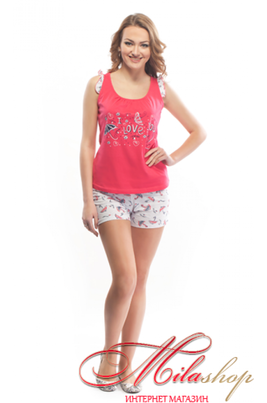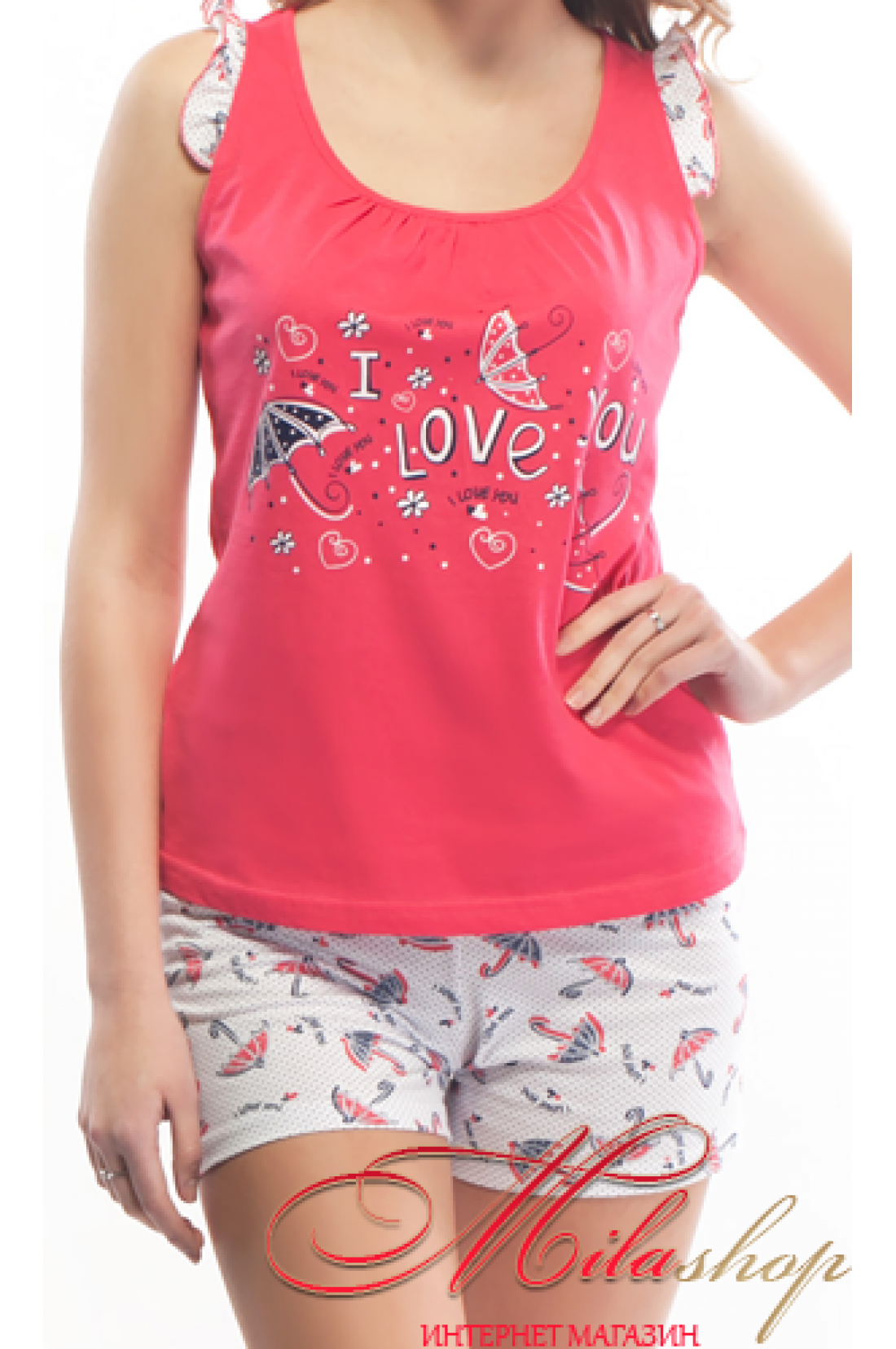 Стильная пижама с шортиками свободного пошива. Украшена принтом "зонтики". Выполнена из высококачественного хлопкового полотна.