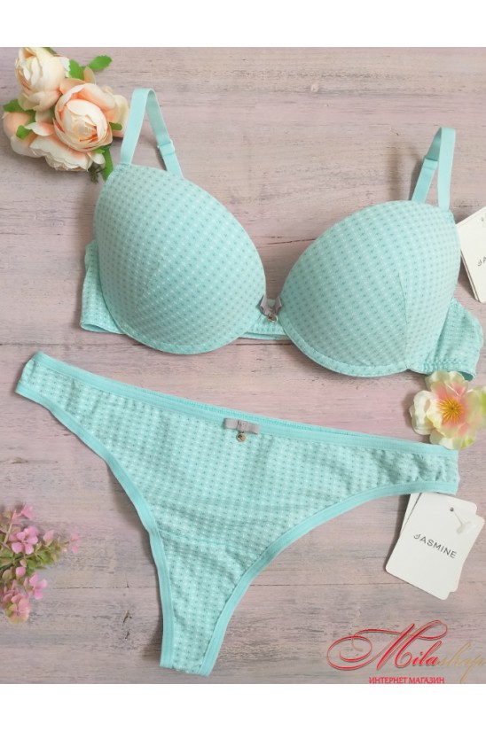 Очаровательный хлопковый комплект нежного мятного цвета. Состоит из бюстгальтера и трусиков стринг. Бюст со встроенным push-up; формованные чашки на косточках; бретели не снимаются, регулируются по длине; принтованное хлопковое полотно с силиконовой обработкой; Яуглубленная линия декольте; спинка гладкая; застежка на спине.