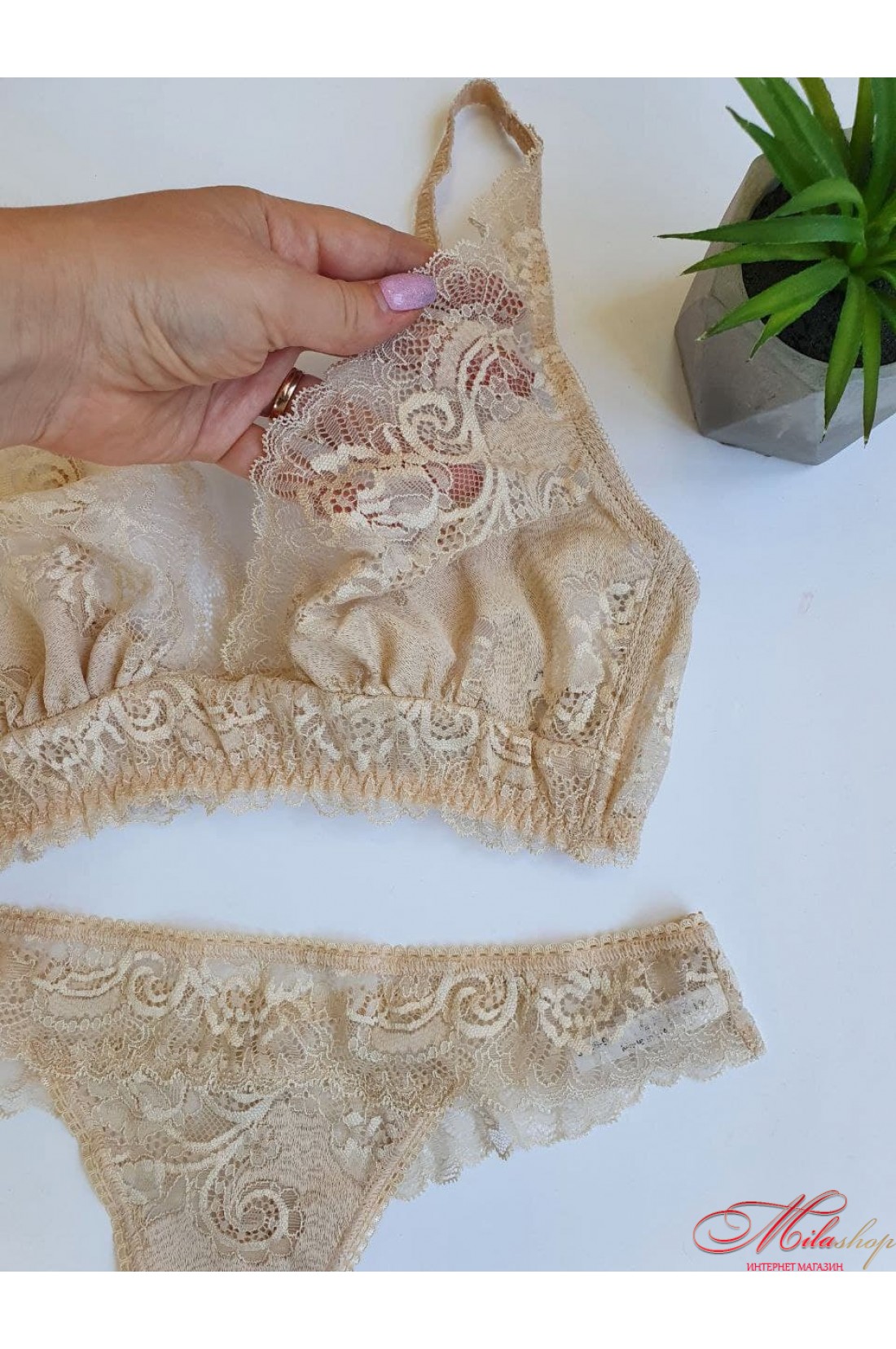 Нежный кружевной комплект. Состоит з бралета и трусиков стринг. Бюст полностью кружевнойй, чашка мягкая, без пуш-ап и косточек. Трусики полностью кружевные, ластовица хлопок.