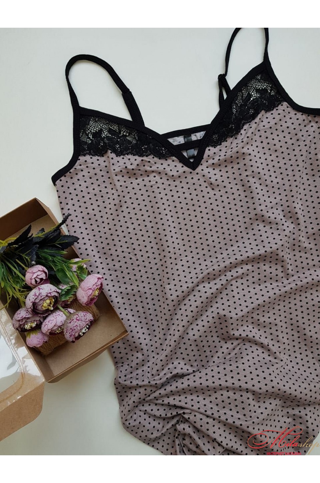 Ночная рубашка универсального прямого силуэта на тонких бретелях. Выполнена из вискозы со вставками кружева.