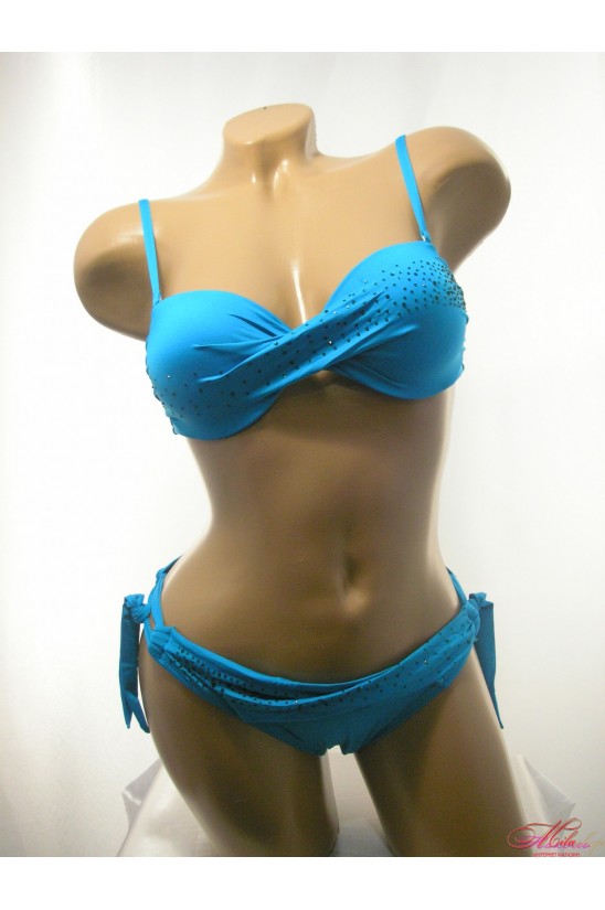 Стильный молодежный купальник из высококачественного быстросохнущего полотна. Бюстгальтер "бандо" с эффектом пуш-ап, съемные бретели, украшен камнями.Трусики-слип на завязках, с низкой линией талии. Размер европейский.
