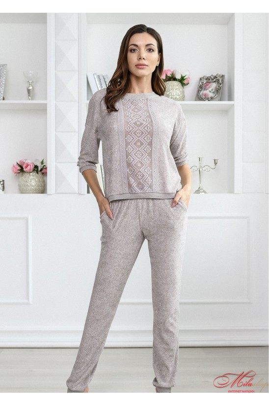 Легкий и уютный комплект домашней одежды с геометрическими вставками-узорами для повседневной носки. Джемпер с рукавом ¾ и спущенным плечом, не стесняет движений. Горловина классическая круглая, под горло. Штаны немного зауженные, с манжетами, в верхней части удобные кармашки. Комплект выполнен в спокойной цветовой гамме – пастельный меланж.
