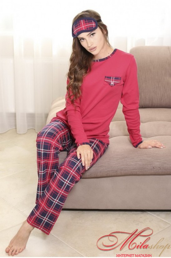 Пижама женская из натурального трикотажного хлопкового полотна! Силует комплекта-полуприлегающий, рукав - реглан, длинный, штаны прямого кроя в крупную клетку. Состав : 100% хлопок.