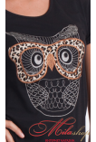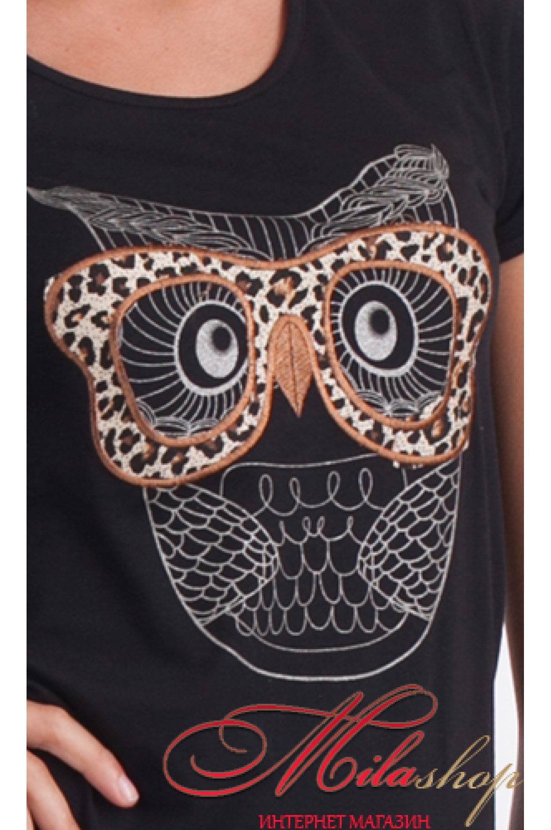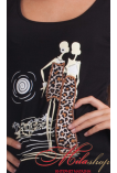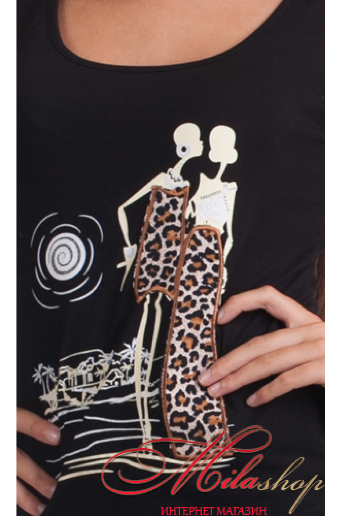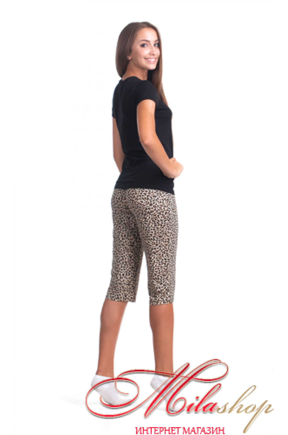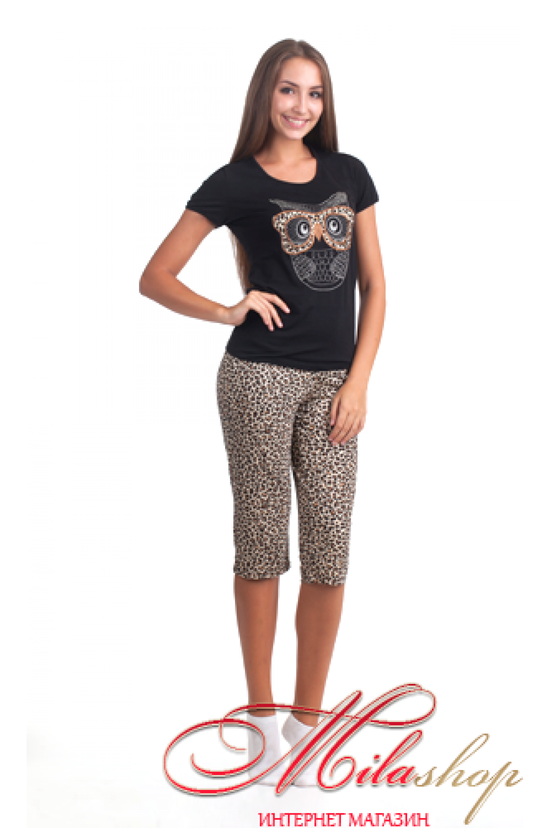 Стильная пижама из хлопка. Верхняя часть в виде футболочки с коротким рукавом, украшена рисунком. Капри выполнены в леопардовом орнаменте.