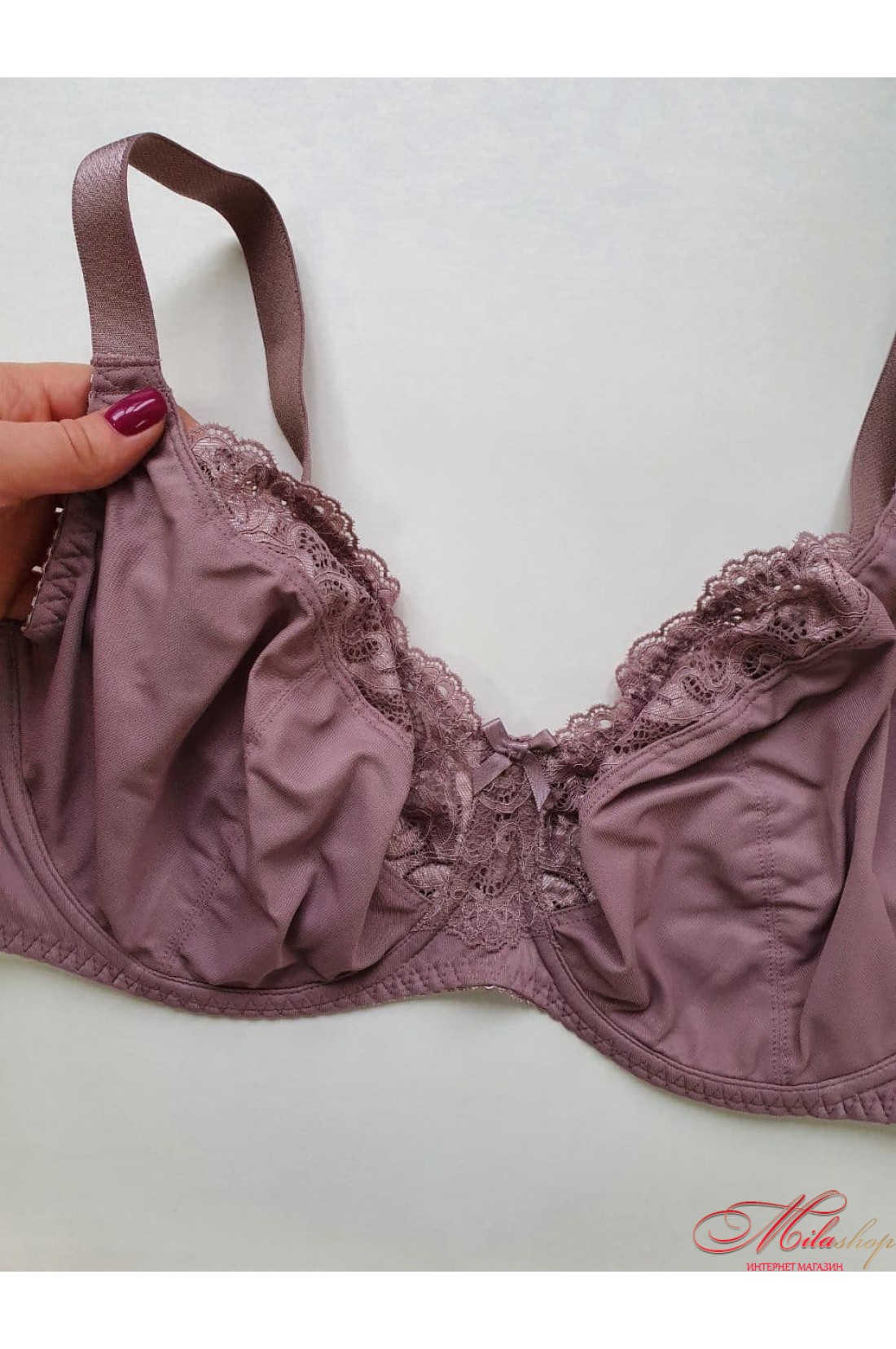 Бюстгальтер из эластичного полотна, трикотажного полотна и эластичного кружева. На каркасах. Мягкие чашки с тройным диагональным членением. Отделка - бантики. Застёжка в 4 ряда крючков.
