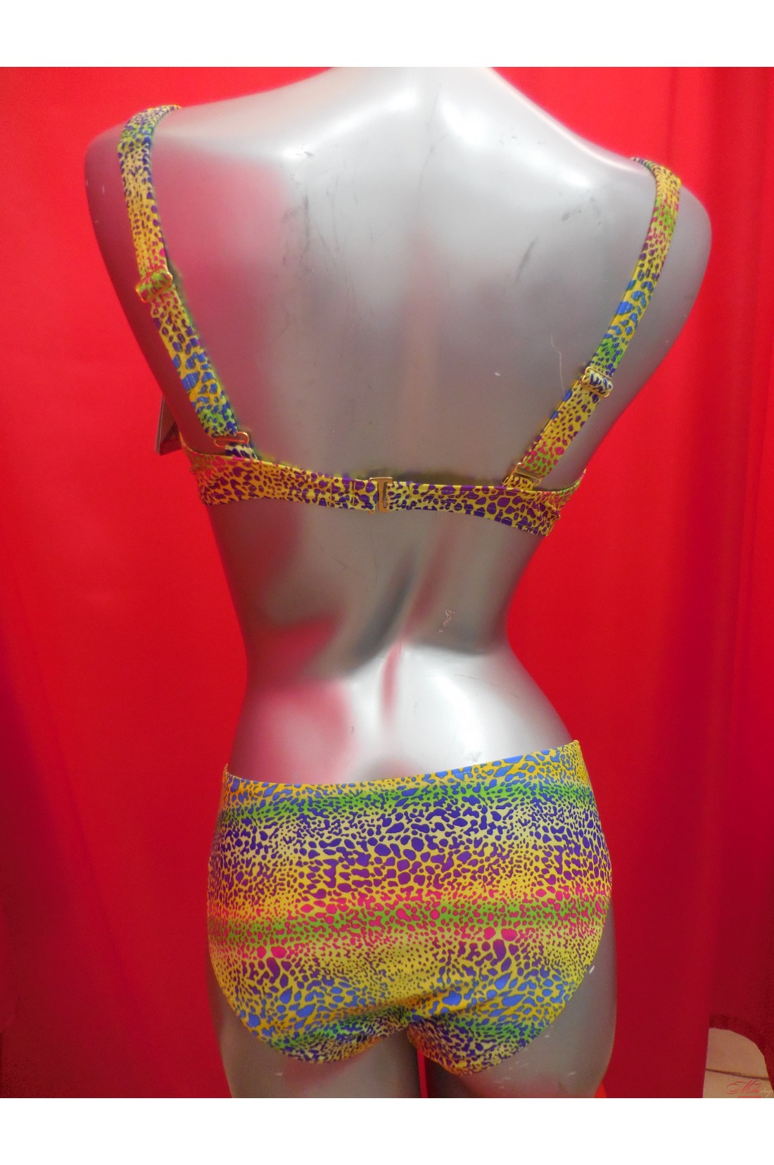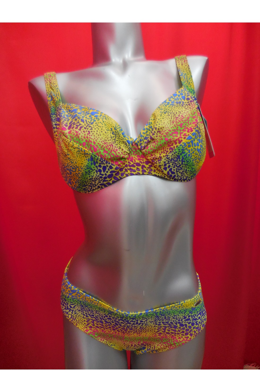 Бюстгальтер на косточках, с мягкими чашками. Широкие регулируемые бретели. Благодаря боковой вставке сближает грудь к центру. Трусики со средней линией талии. Размер чашки купальника Е
