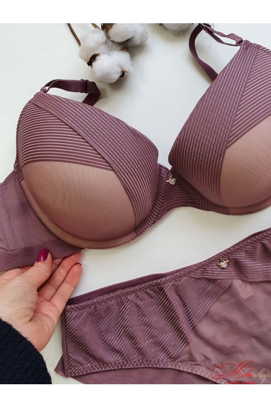 Бюстгальтер с небольшим эффектом пуш-ап. Бретели съемные, регулируются по всей длине. Чашки бюстгальтера украшены драпировкой. Пояс на широкой резинке и с дополнительной боковой косточкой. Трусики-бразилиана из микросеточки с драпировкой, задняя деталь с вертикальным швом посередине, средняя линия талии, хлопковая ластовица.
