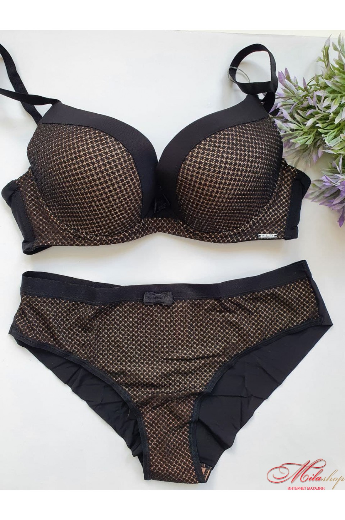 Бюстгальтер с эффектом пуш-ап. Бретели несъемные, регулируются по всей длине. Чашки бюстгальтера почти полностью украшены сетчатым полотном. Пояс на широкой резинке и с дополнительной боковой косточкой. Трусики из микрофибры, задняя деталь с вертикальным швом посередине, средняя линия талии, широкая резинка, хлопковая ластовица.