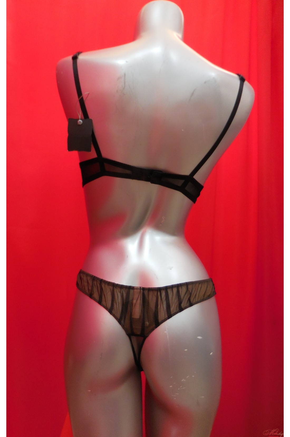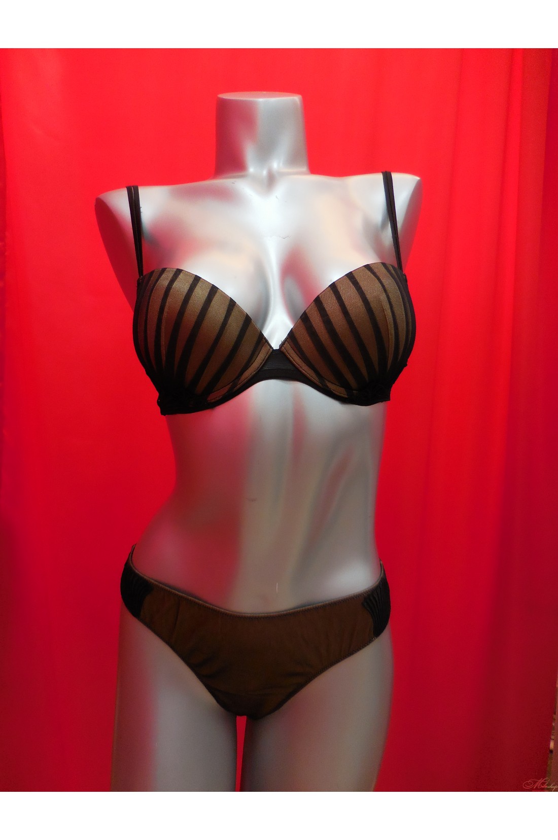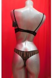 Бюстгальтер с эффектом пуш-ап, зрительно увеличивает грудь. Регулируемые бретели. Чашки бюстгальтера украшены драпировкой. Трусики стринги с низкой линией талии.