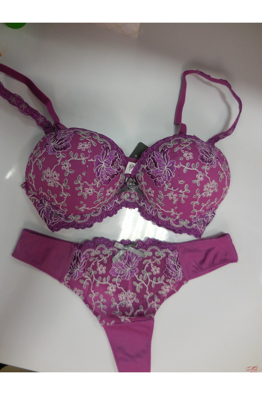 Комплект нижнего белья придаст Вам гармоничного настроения в эти серые будни ,декорирован итальянской вышивкой и бантиком со семными брителями и чашками пуш-ап. Трусики стринги.