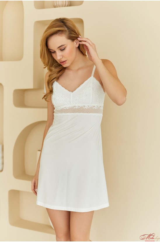 Очаровательная ночная сорочка. Выполнена из мягкого полотна и кружева, имеет оригинальную форму. Бретели тонкие - регулируемые. Длина выше колена.