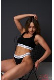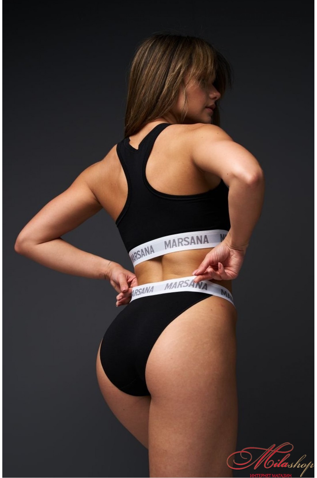 Хлопковый комплект белья с логотипом бренда. Хлопковое полотно пропускает воздух и впитывает влагу, не вызывает раздражения на чувствительной коже, не вызывает аллергию. Топ без чашек, косточек и уплотнителей, под грудью широкая эластичная брендированная резинка для поддержки. Трусики танга с широкой эластичной резинкой, средняя линия талии, хлопчатобумажная гигиеническая ластовица.