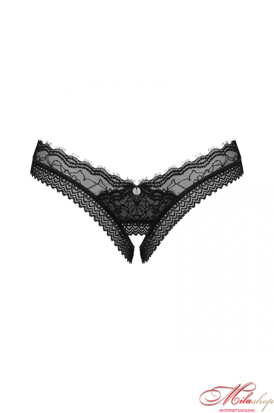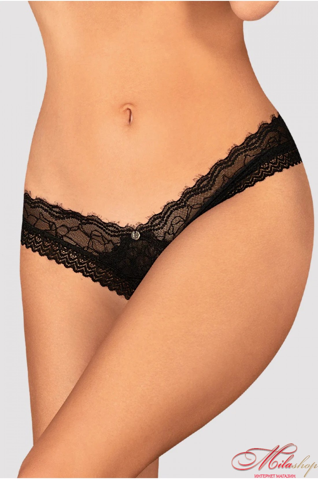 Трусики стринги из деликатного кружева, заниженная линия талии с V-образным вырезом пояса, спереди подвеска с логотипом, подчеркивают ягодицы, разрез в ласточке.
