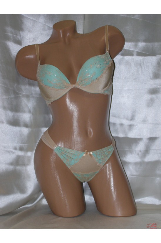 Роскошный комплект нижнего белья состоит из бюстгальтера с эффектом пуш-ап, со съемными бретелями, в комплекте трусики-стринги с низкой линией талии. Комплект выполнен из нежного эластичного полотна и кружевного эластичного полотна. Кружево украшено камнями сваровски.