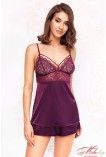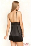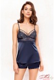 Женский бельевой комплект из сатина и кружева, состоящий из удлиненной майки и шорт. Майка с пикантным кружевным лифом со стрепами, на тонких бретелях с регуляторами длины. Треугольные чашки лифа имеют подкладку нюдового цвета из модала, что создает эффект «голого тела», но в то же время прикрывают грудь. Шорты прямые короткие, с эластичной резинкой по верхнему краю.