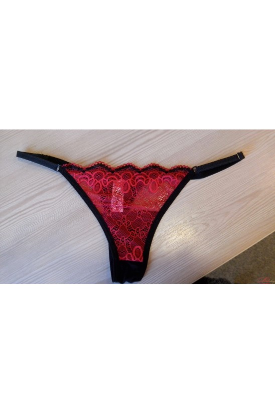 Соблазнительные трусики-стринги из кружева. Низкая линия талии. Тонкие веревочки, с регулятором ширины, приоткрывают линию бедра. Трусики выполнены в сочетании красного и черного цвета.