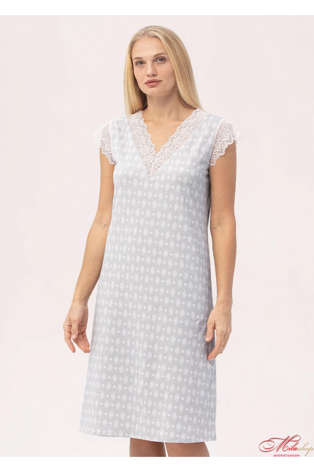 Классическая женская рубашка с аккуратным принтом прямого силуэта. Рубашка совсем не ограничивает движения, мягкая и легкая. Особенностью изделия можно выделить дизайн верхней части – необычное расположение кружева и ткани, они придают пикантности, открывая немного область груди. Изделие смотрится очень нежно и аккуратно, в нем легко как отдыхать, так и заниматься повседневными делами.