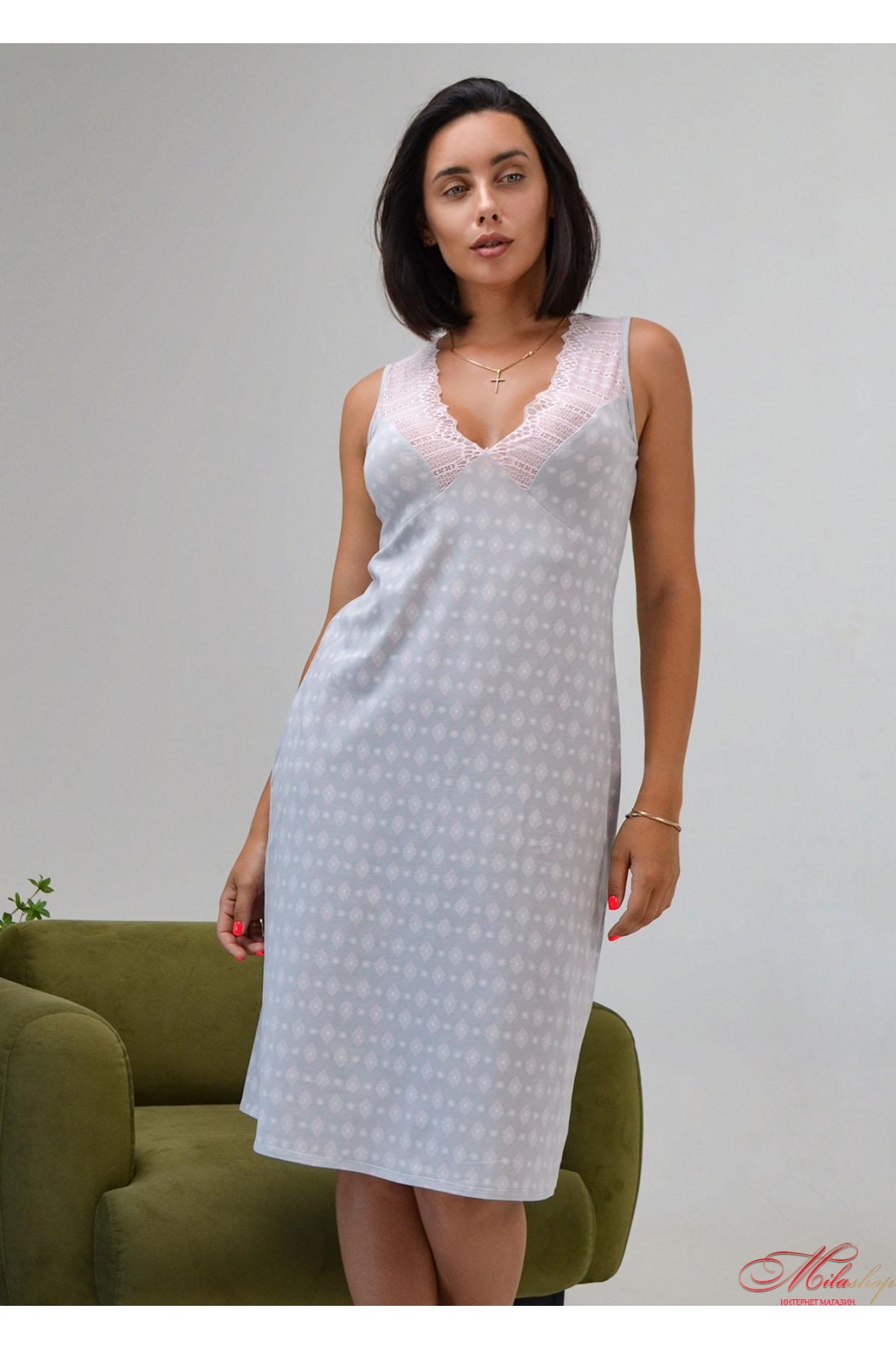 Классическая женская рубашка с аккуратным принтом. Силуэт полуприлегающий, рубашка совсем не ограничивает движения, мягкая и легкая. Особенностью изделия можно выделить дизайн верхней части – необычное расположение кружева и ткани, они придают пикантности, открывая немного область груди. Изделие смотрится очень нежно и аккуратно, в нем легко как отдыхать, так и заниматься повседневными делами.