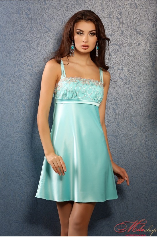 Ночная сорочка из эластичного сатина на тонких бретелях с регуляторами длины, кокетка украшена нежным кружевом. Длина сорочки - до середины бедра.
