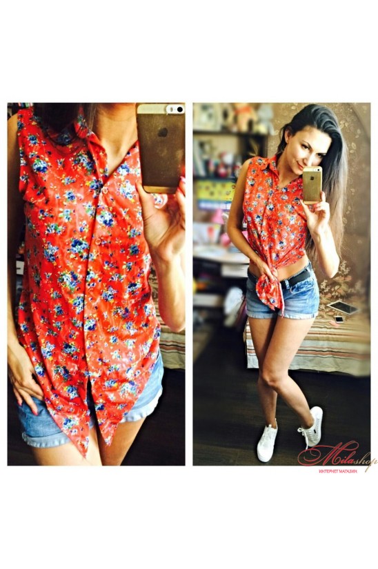 Яркая, стильная шифоновая блуза с цветочным принтом. Без рукавов.
