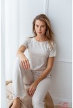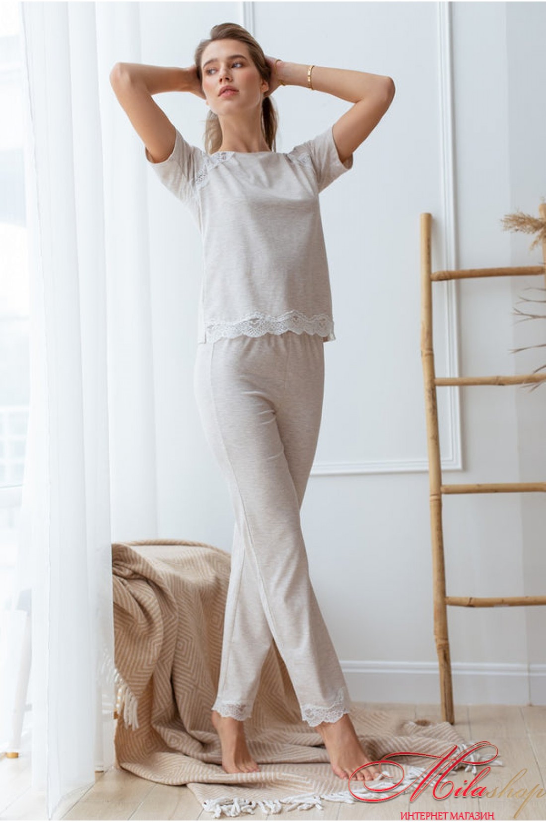 Комфортный комплект футболка и штаны, выполнена из вискозного материала. Футболка приталенного кроя. Брюки прямого кроя с мягкой резинкой на поясе. Комплект украшен вставками из кружева. Состав: 95% вискоза, 5% эластан.