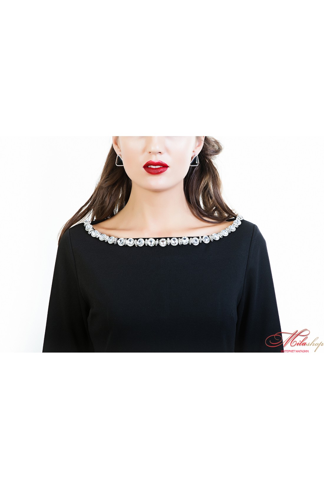 Стильное платье в черном цвете. Верх декорирован декоративным ожерельем. Длинный рукав. Длина платья около 93 см.