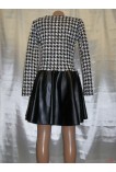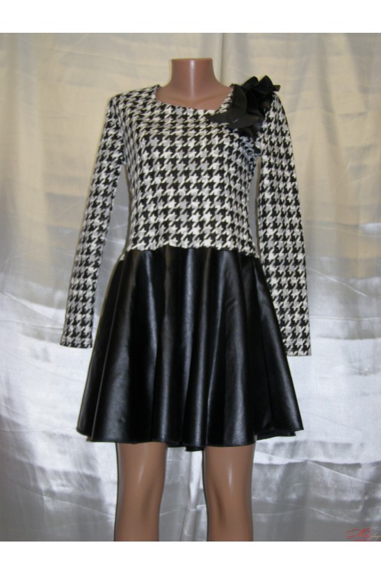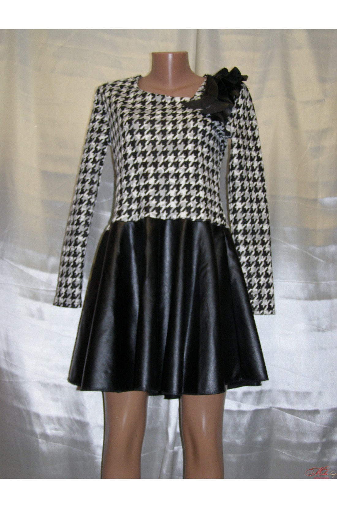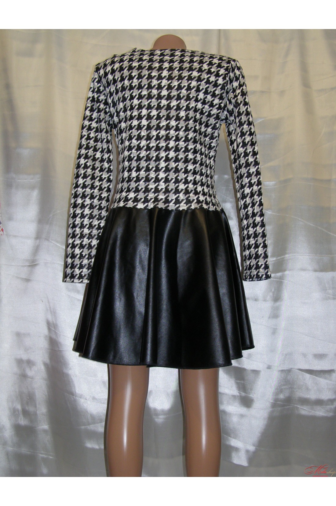 Стильное женское платье с длинным рукавом. Верхняя часть платья из плотного трикотажа с оригинальным узором, нижняя часть в виде кожаной юбки свободного кроя.