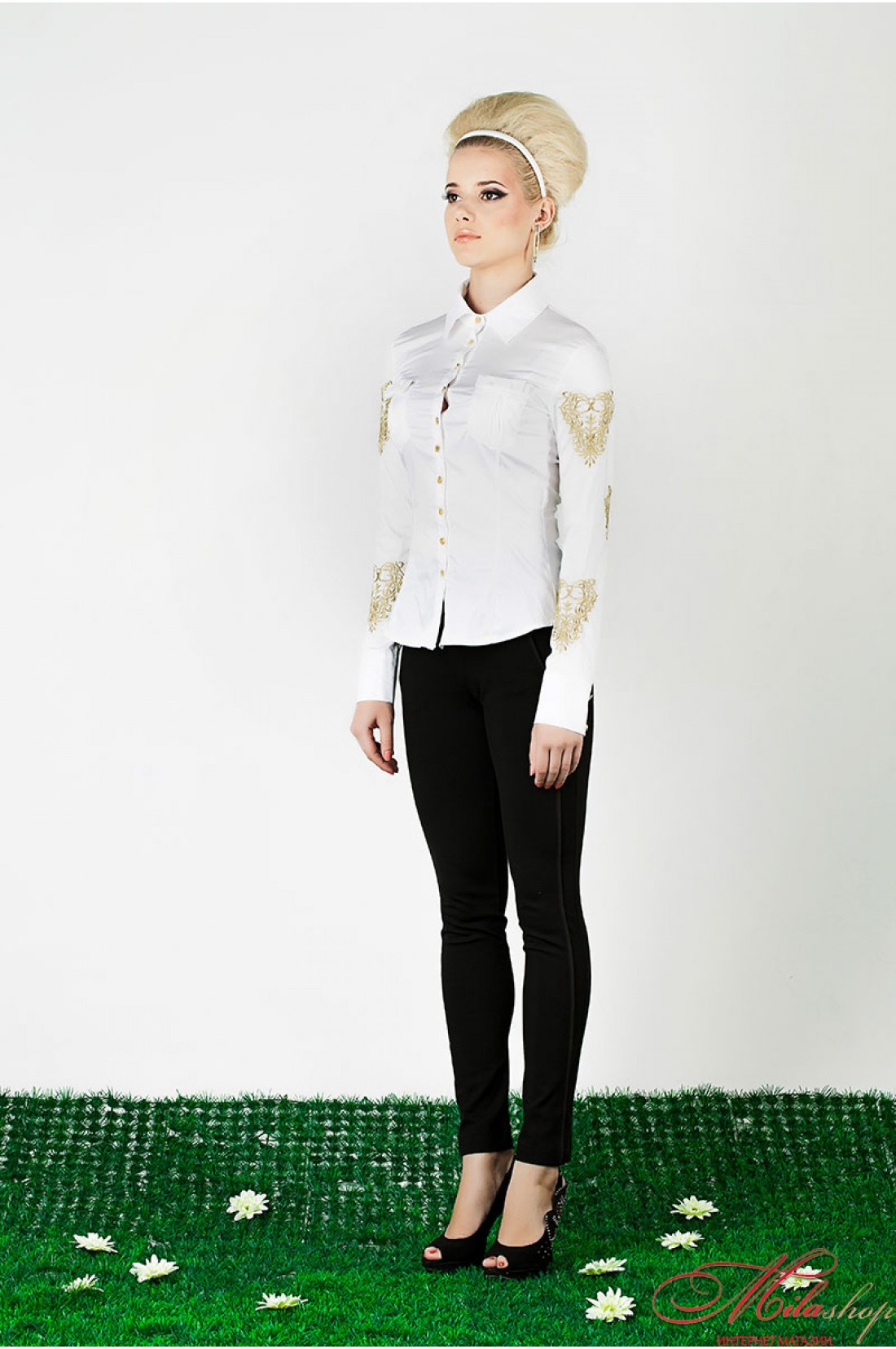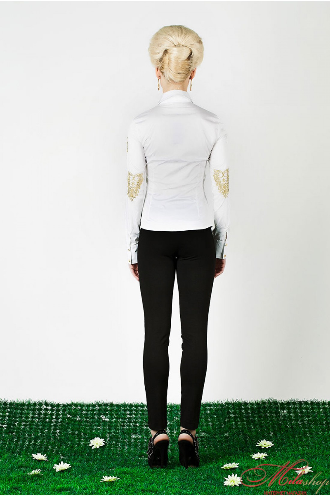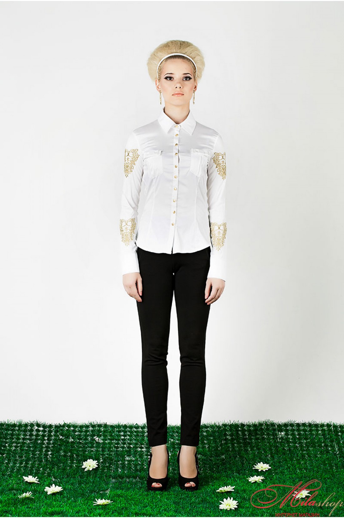 Стильная стрейчевая блуза. Рубашечный воротник, длинные рукава на манжете, украшены золотой вышивкой. Два накладных кармана украшены декоративными бантиками.