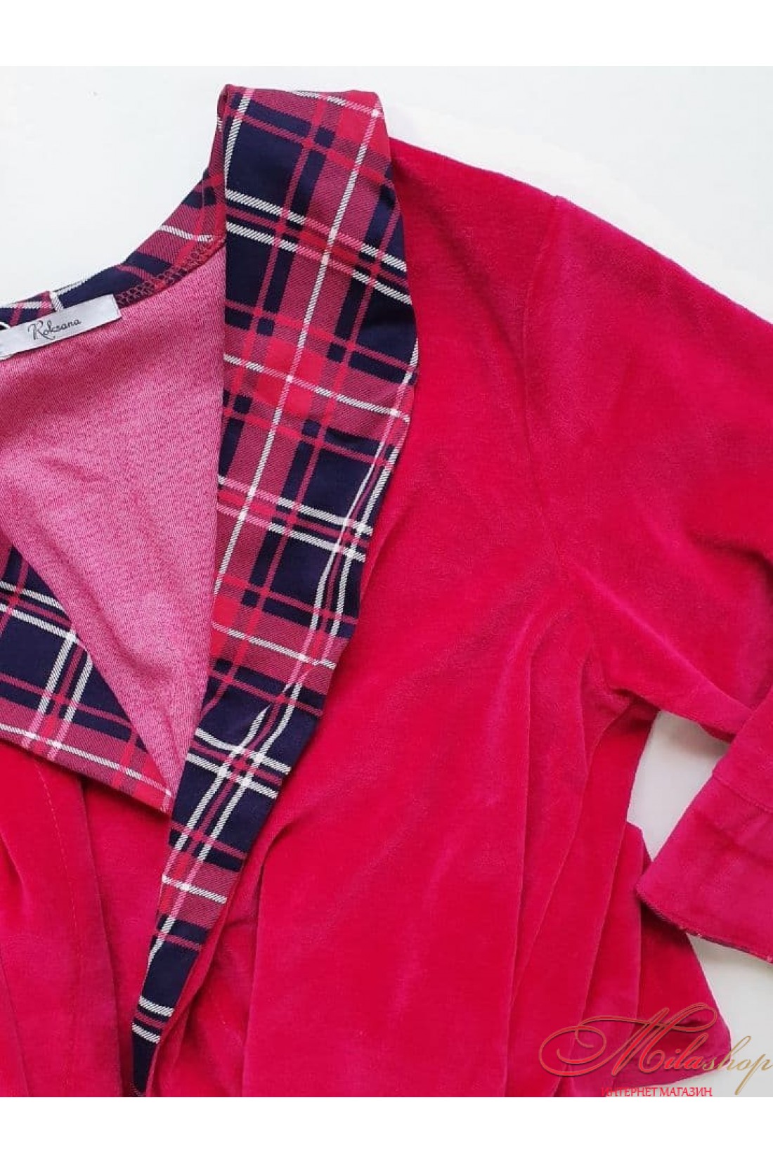 Комфортый и стильный халат для прохладного сезона. Выполнен из хлопкового велюра. Ворот и манжеты рукавов оформлены подкладкой с клетчатым принтом. С карманами. Завязывается на пояс.
