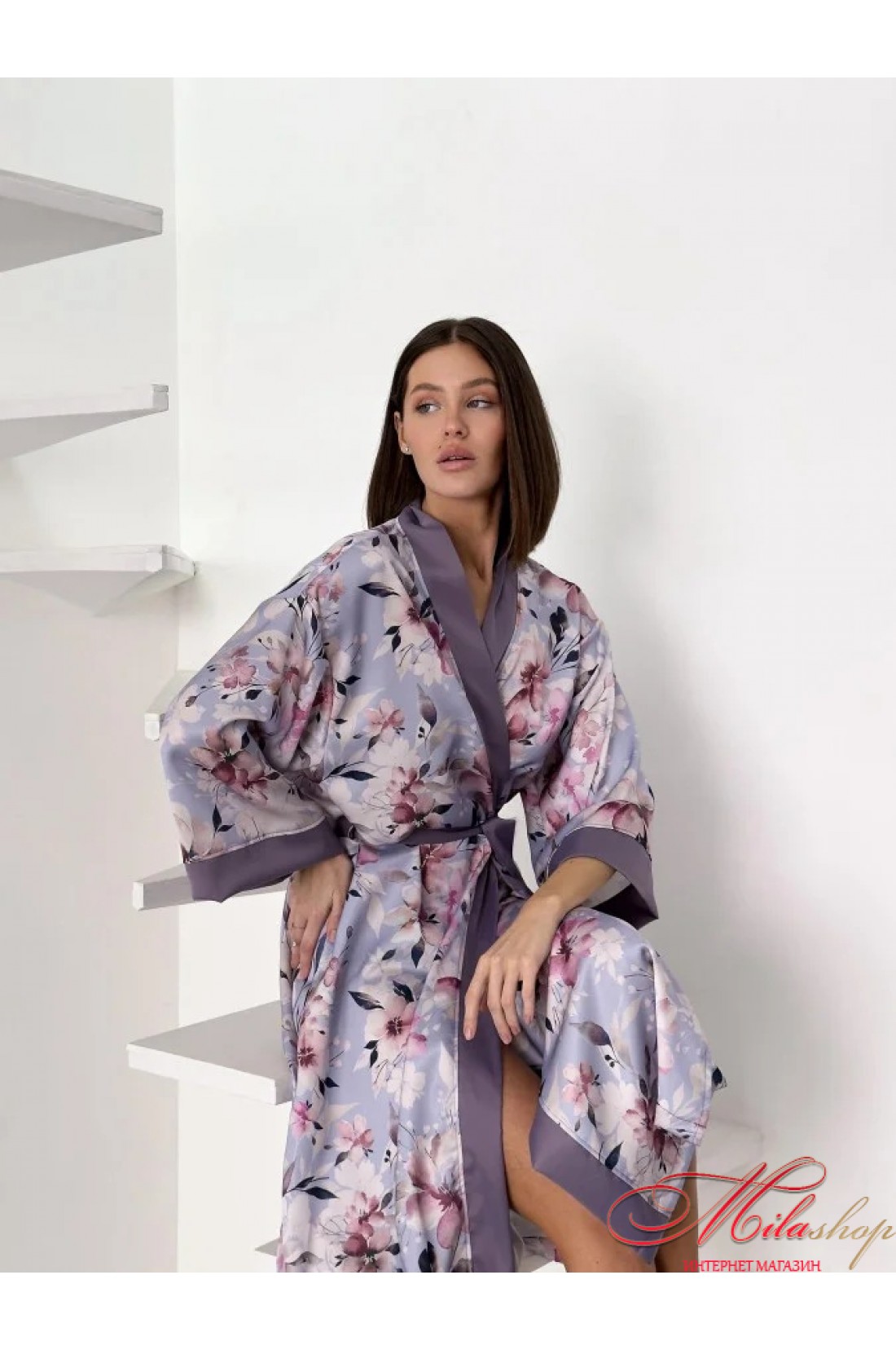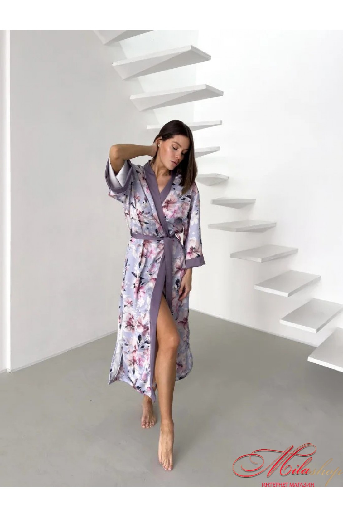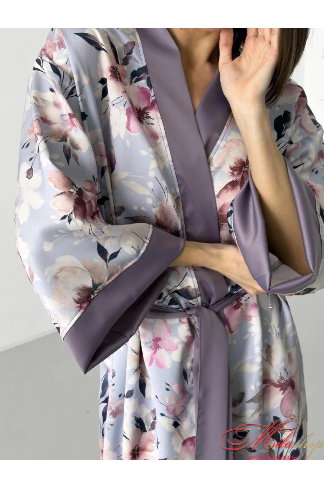 Халат в стиле кимоно: элегантность, которая приносит расслабление и красоту. Позвольте себе роскошь быть в окружении красоты и комфорта с нашим халатом из шелк-сатина. Его нежная расцветка цветов пастельных оттенков на лавандовом фоне создает атмосферу спокойствия и гармонии. Два изящных разреза по краям дарят легкость движений, а контрастная окантовка придает элегантности. Шелк-сатин, словно вторая кожа, обнимает ваше тело, создавая ощущение непринужденного комфорта и воздушности. Этот халат станет идеальным дополнением для вашего домашнего уюта, а также для утренних или вечерних ритуалов красоты. Почувствуйте расслабление и красоту с каждым прикосновением. Халат, создающий гармонию в вашей жизни. Ткань: шелк сатин, 100% полиэстер. Цвет: цветы на лавандовом цвете. Длина халата: 128-130 см. Длина рукава (от горловины): 70-72 см.