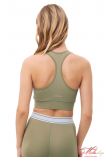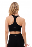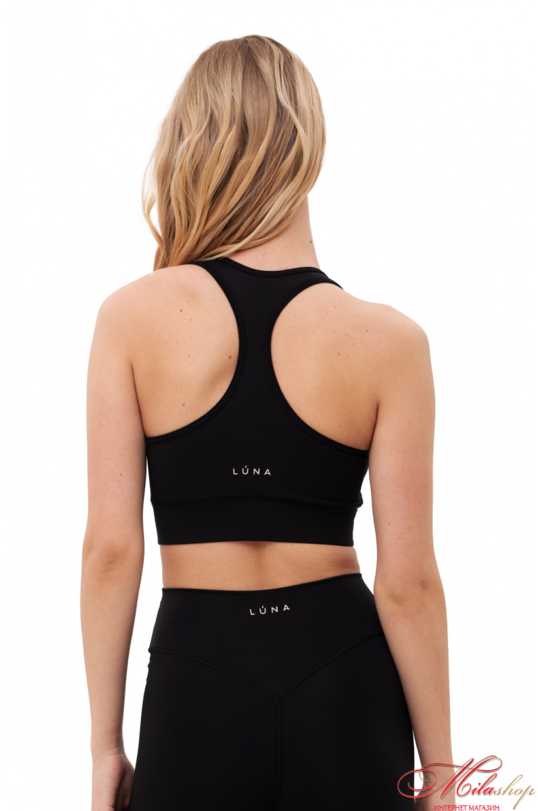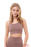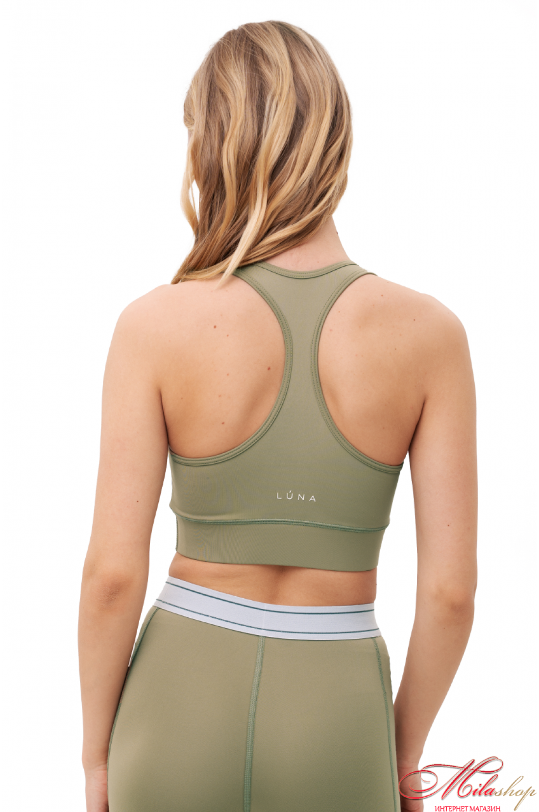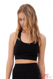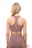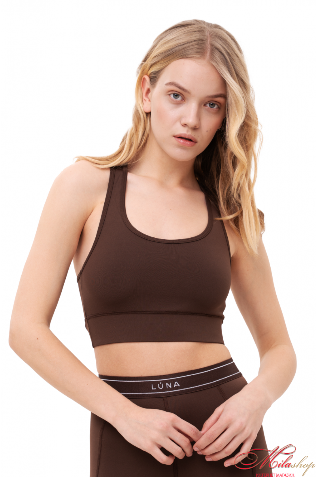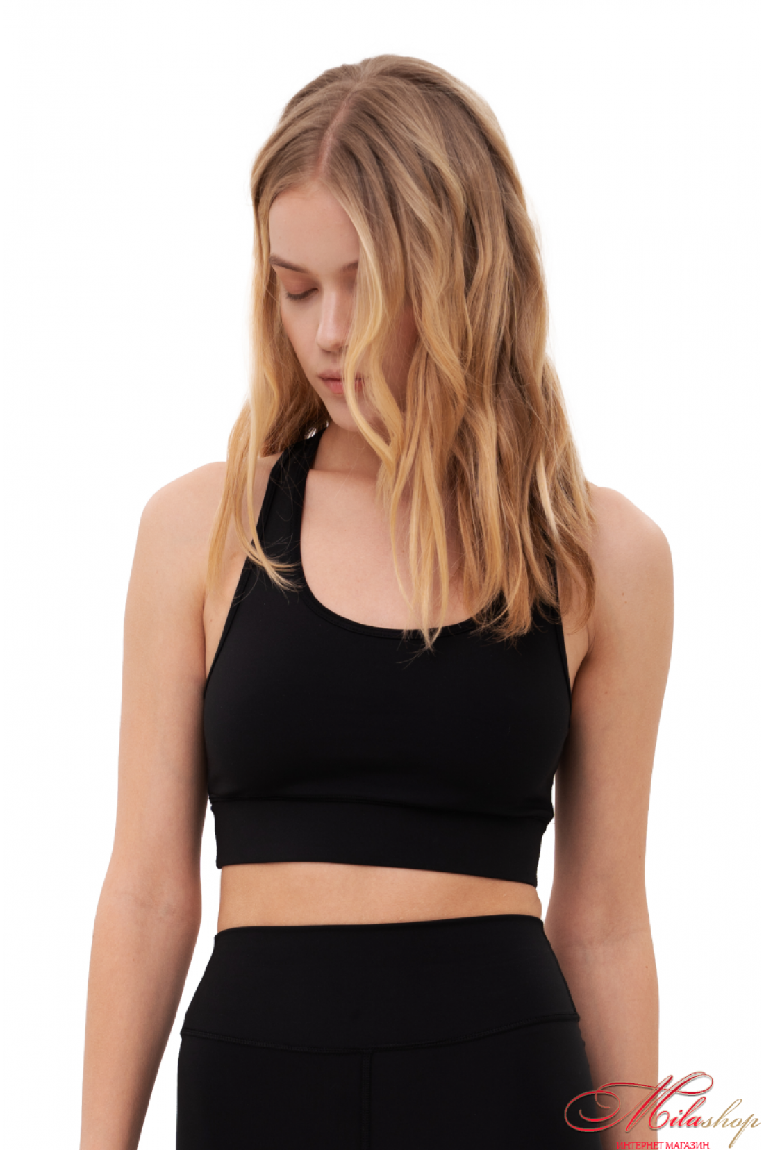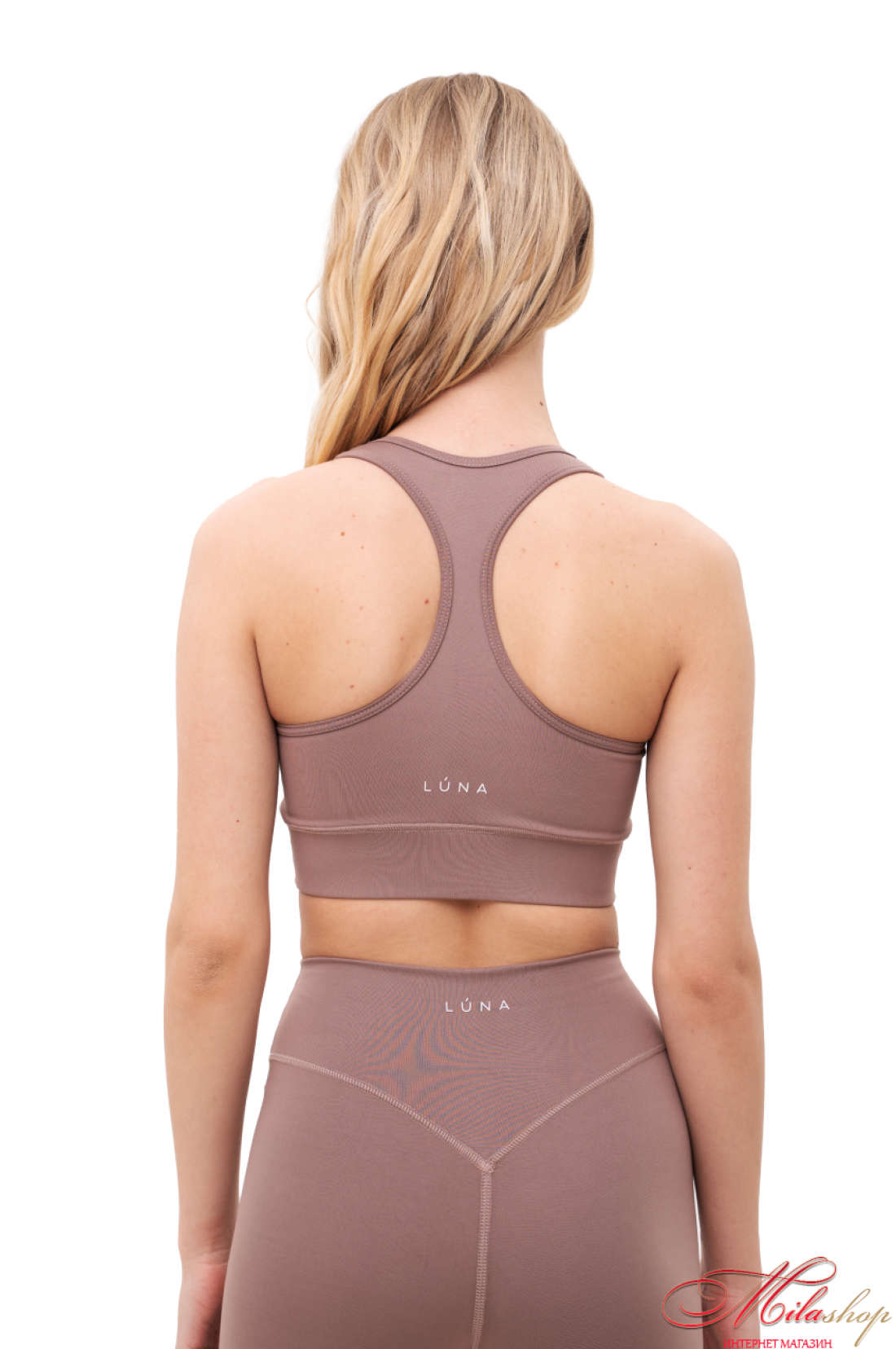 Кроп топ длиной до солнечного сплетения, имеет округлую горловину впереди, и фигурную Y-образную спинку. По низу – манжет с резинкой, для лучшего прилегания по фигуре. Топ с подкладкой из основной ткани, то есть двойной, за счет чего он более плотный. Над швом пришивания манжеты по центру спинки есть брендировка. Ткань - бифлекс, хорошо тянется, имеет гладкую фактуру, цвет капучино имеет большую плотность, и меньше тянется, это учтено в лекалах.